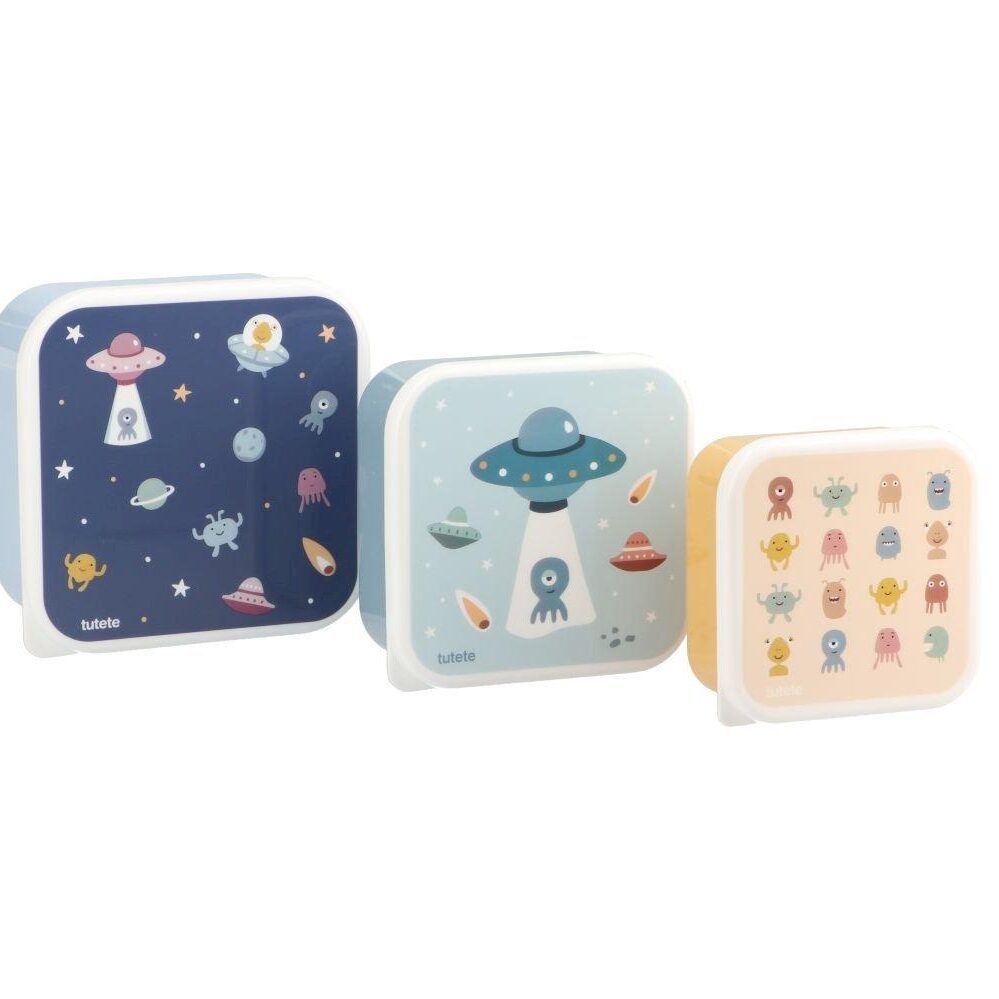 Set de 3 cajitas almuerzo, con diseños exclusivos de Tutete, y fenomenal para llevar distintos tipos de alimentos separados al colegio.