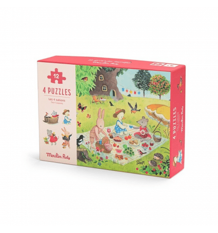 Cuatro puzzles, uno de cada estación del año, de 12 piezas. En el interior también encontrarás las ilustraciones de cada uno de ellos para poder utilizarlas como plantilla.