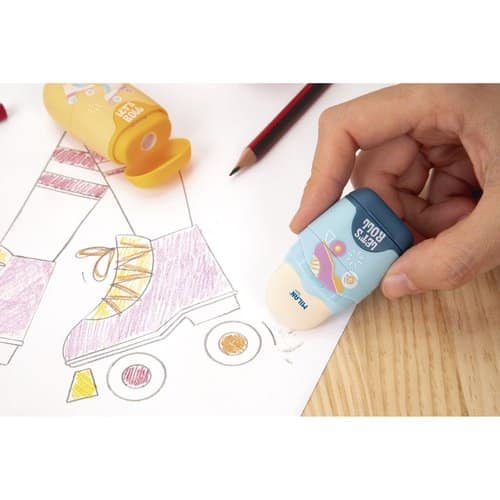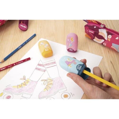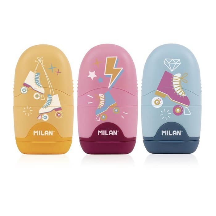 Combinación de goma de borrar y sacapuntas con depósito. Diseño CAPSULE, serie especial Roller. El sacapuntas dispone de una cuchilla de acero afilada y resistente, ideal para todo tipo de lápices. Sacapuntas con cuchilla de seguridad: este sistema evita que se pueda separar la hoja del cuerpo del sacapuntas. Diseño original creado por el departamento de I+D de MILAN. Contiene 5 unidades de color azul, 5 de color amarillo y 5 de color rosa. Gomas de borrar de recambio disponibles en formato blíster (ref. BNM10258)