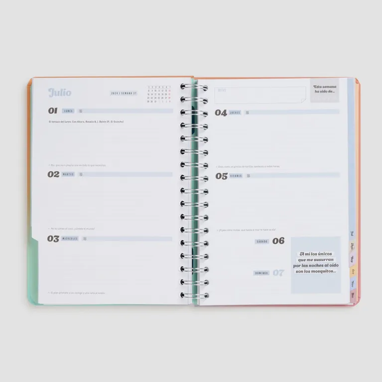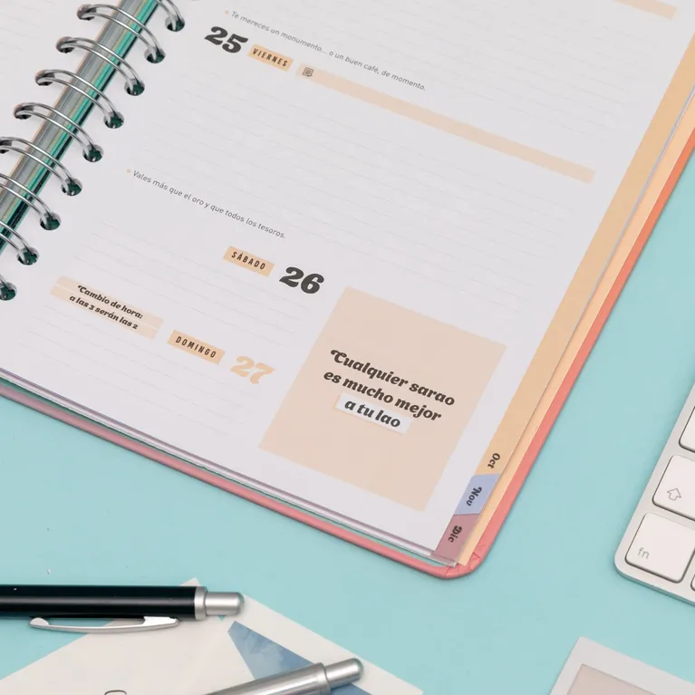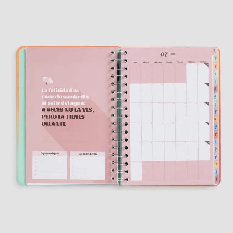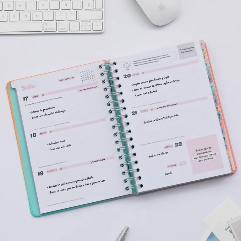 Agenda de estilo Office de Mr. Wonderful, con planificación para 18 meses: va de julio de 2023 a diciembre de 2024 y es de vista semanal. Cuenta con la certificación FSC, que garantiza que ha sido fabricada con papel obtenido de bosques gestionados de forma responsable. Esta agenda contiene: • 226 páginas realizadas en papel de 100 gr con la certificación FSC. • Frases diarias motivacionales. • Separadores con pestaña para cada mes. • Bolsillo interior de cartón. • Regla de plástico interior. • 8 hojas de pegatinas. • Horarios y calendarios (del último trimestre de 2023 y de 2024 y 2025 completos). • Playlist exclusiva. • Páginas para anotar contactos. • Tablas de ahorro. • Cierre con goma elástica. • Blocs de notas adhesivas con formas. • Planificador mensual al inicio de cada mes. • Frases mensuales supermotivadoras.
