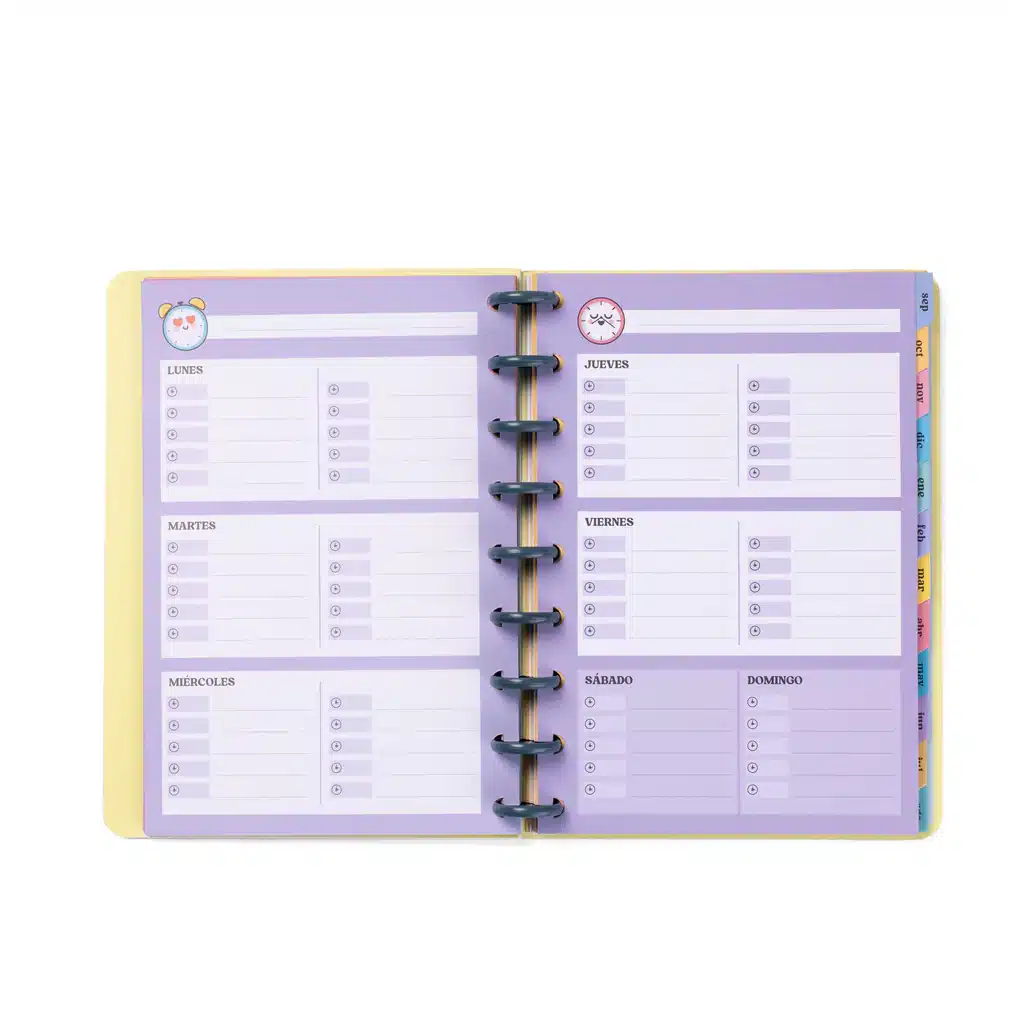 • Extras: Frases motivacionales diarias, separadores mensuales con pestañas, bolsillo interior de cartón, regla de plástico, 8 hojas de pegatinas, juegos y extras entretenidos, horarios y calendarios (2025-2027), playlist exclusiva, páginas para contactos, tablas de ahorro, cierre con goma elástica, blocs de notas adhesivas con formas y planificador mensual al inicio de cada mes