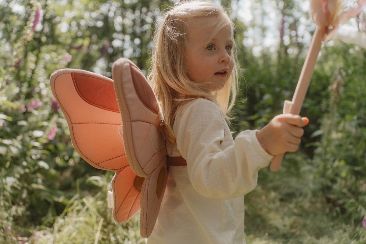 Tu pequeña se divertirá mucho con estas alas de hada y varita de la colección Fairy Garden. Las alas son fáciles de llevar gracias a las correas elásticas para los hombros. El look de hada se completa con la varita de ensueño con lazos. Perfecta para momentos de juego y fiestas de disfraces.Fabricado en algodón orgánico 100%Medidas Alas de Hada: 35x41x2 cm Varita mágica: 32x10x4 cm Tamaño caja: 35x41x4 cm