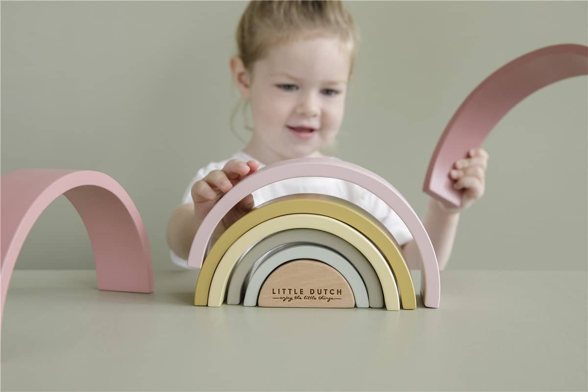 El arco iris de madera de LIttle Dutch es una torre de madera con forma de hermoso arco iris. El arco iris se ve muy bien en la habitación de un niño y es divertido jugar con él. Consta de 7 arcos que encajan entre sí. Su hijo puede usar estas formas semicirculares para jugar y aprender y para hacer todo tipo de creaciones utilizando su imaginación. Los arcos también se pueden utilizar como un túnel de tren, una casa para muñecas o montañas para coches pequeños.