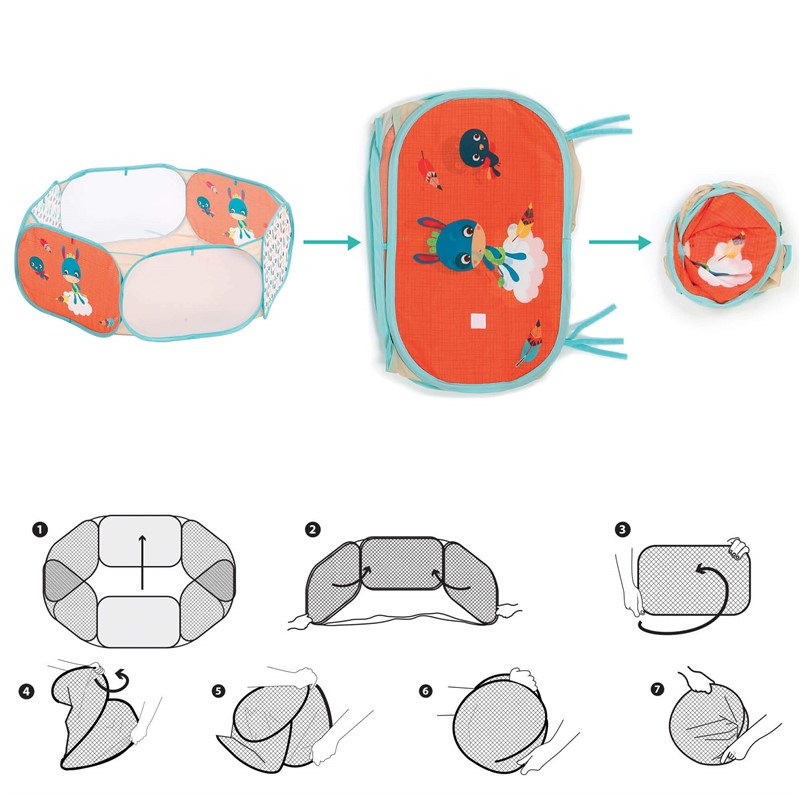 La alfombra también se transforma en una bolsa de transporte compacta y ligera, ideal para llevarla de viaje o a casa de los abuelos. Todo el conjunto es fácil de montar, plegar y transportar, ocupando poco espacio en casa.