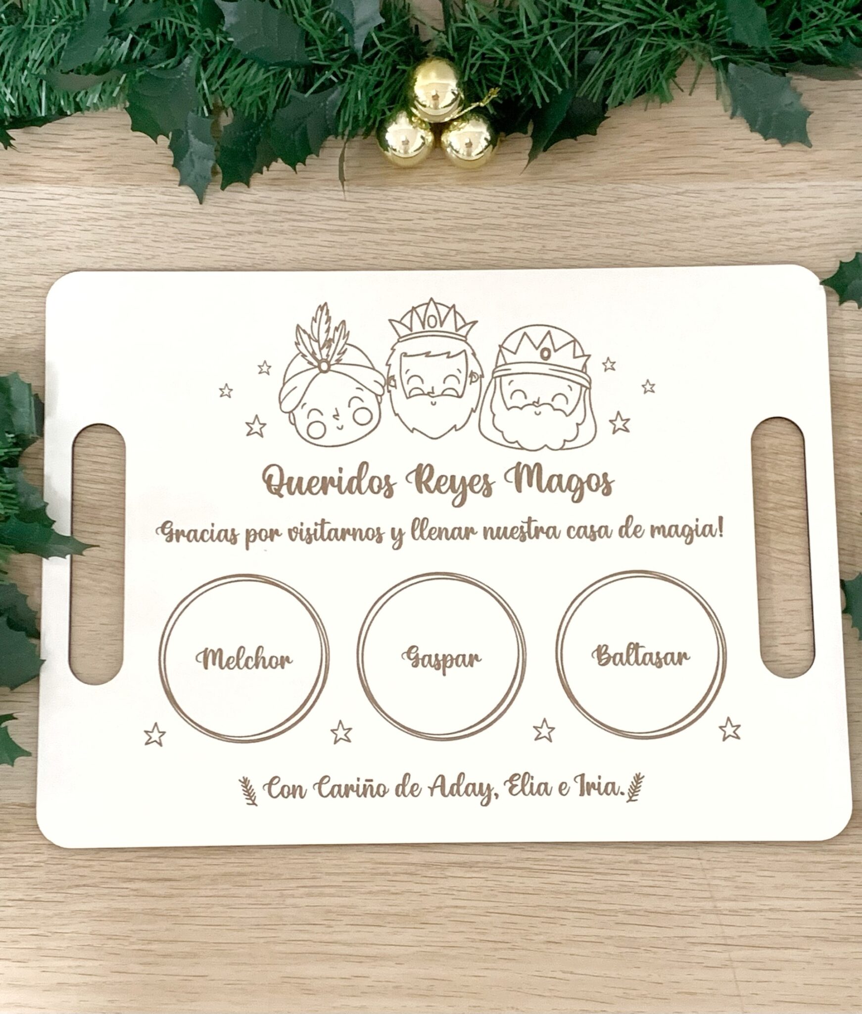 Prepara con ilusión la llegada de los Reyes Magos con esta preciosa bandeja de madera dm  laminada en blanco, donde les podéis dejar comida y bebida para que repongan fuerzas de su largo viaje. La bandeja se puede personalizar con los nombres de los peques de la casa.