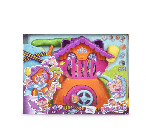 Beastree House es el playset de los Beasties donde guardan todo lo que quitan a los Bellies. En una de las ramas tiene una cesta para poder subir todos los objetos al Beastree House, una hamaca para descansar y un biberon. Podrán espiar Bellyville a través del telescopio y así decidir cuándo pueden atacar de nuevo. Cuando estén listos, podrán bajar por el tobogán y subirse al patinete para poder ir más rápido. Incluye un montón de accesorios para que la experiencia de juego sea super completa. No viene incluido muñeco.