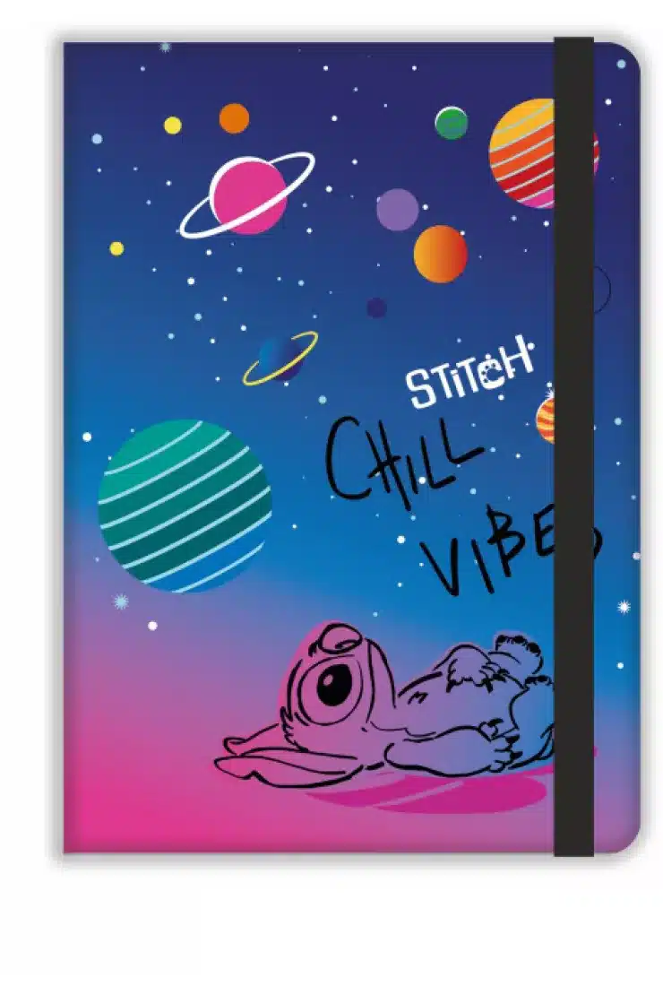 Bloc tamaño A5 con 80 páginas rayadas, tapa dura plastificada y goma elástica de cierre. Diseño moderno de Stitch sobre fondo negro. Ideal para el día a día escolar o personal.