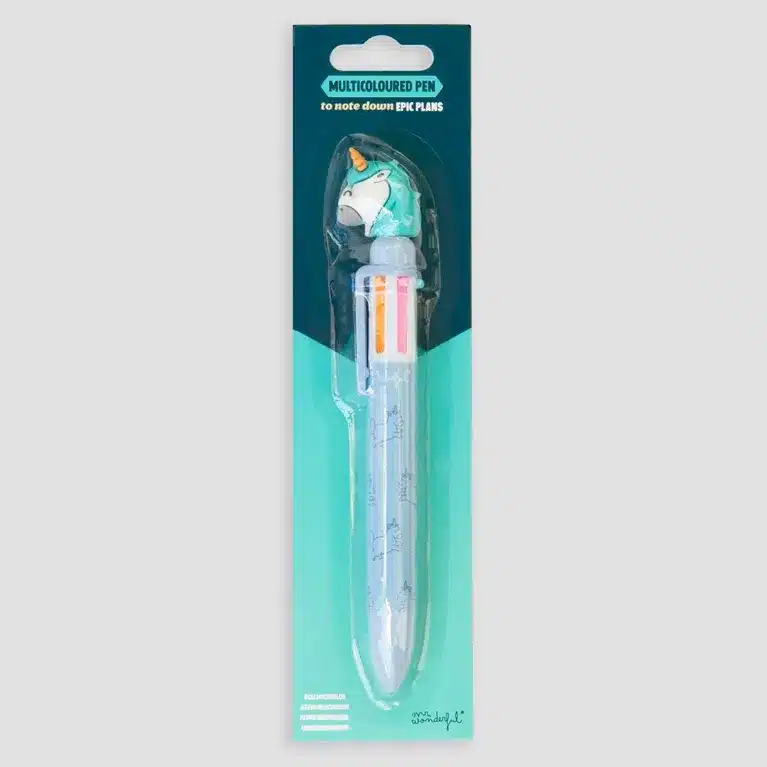 Bolígrafo multicolor, con 6 colores para poder ir cambiando en el mismo bolígrafo. La calidad del mecanismo interior permite que ese cambio de color resulte muy fácil. Está decorado con un unicornio Wonder en su extremo, lo que le aporta originalidad. Los colores de la tinta son: azul marino, azul celeste, verde, naranja, lila y rosa.