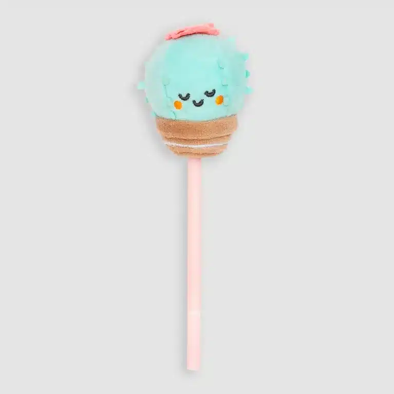 Bolígrafo con un cactus Wonder de peluche en su extremo. La tinta es de color negro.