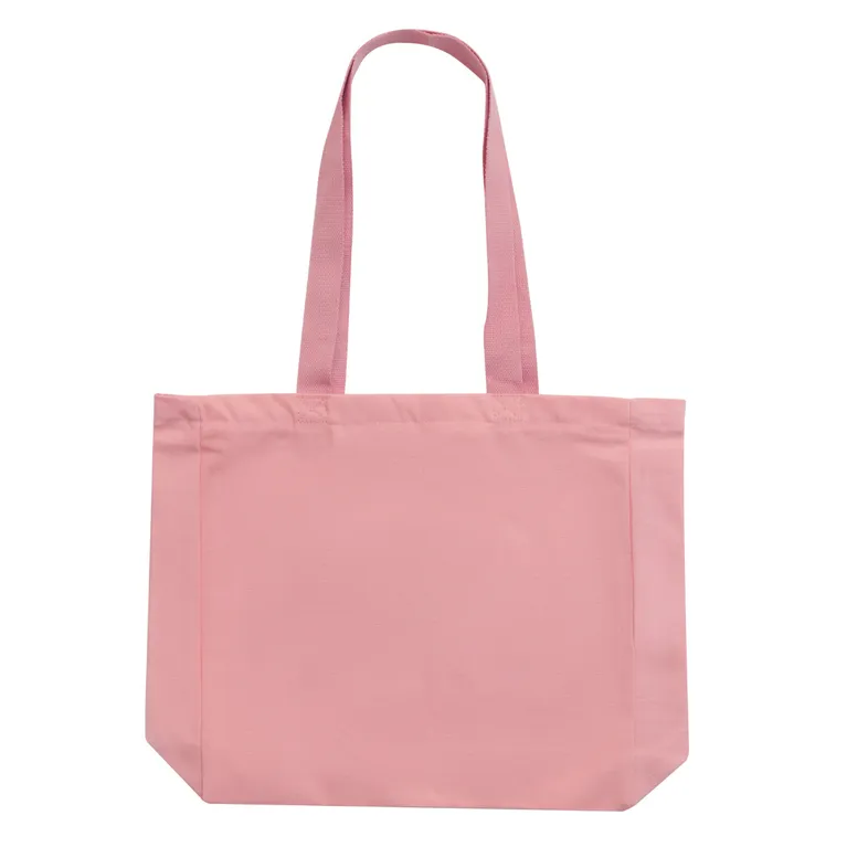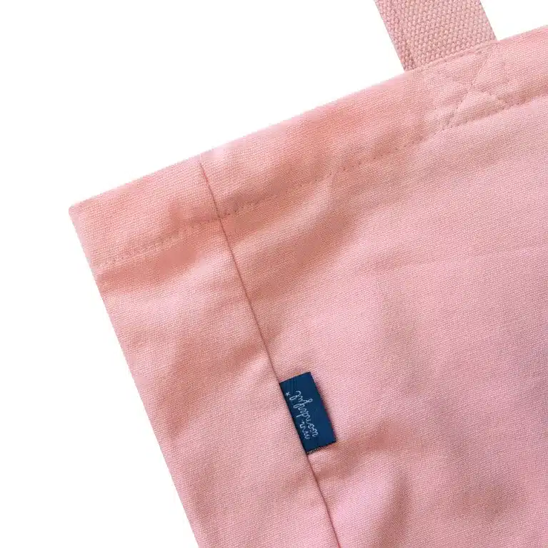 Bolsa de tela estilo tote bag, realizada en algodón, con asas para colgar y un bolsillo interior con cierre de cremallera.