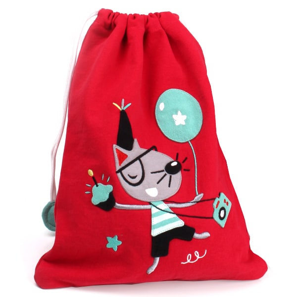 En esta bolsa…¡se está celebrando una fiesta! Este simpático gatito tiene una cámara de fotos, un globo y un pastel cosidos en relieve. También hay aplicaciones bordadas para que la bolsa sea todavía más bonita. Tiene mucho espacio para que los niños lleven la merienda u otros objetos de uso cotidiano. Tiene un cierre de cordeles deslizantes para evitar que caigan cosas desde su interior.