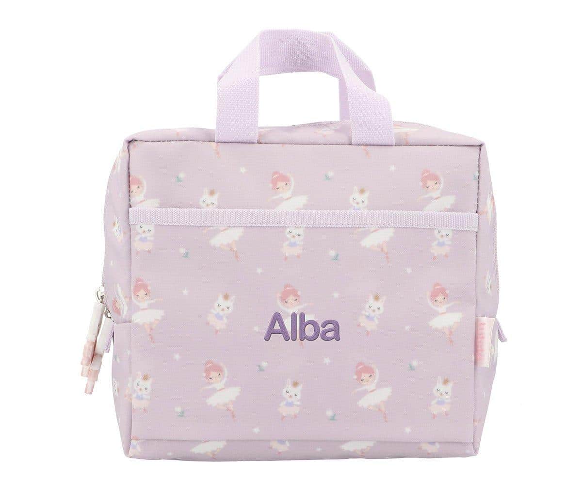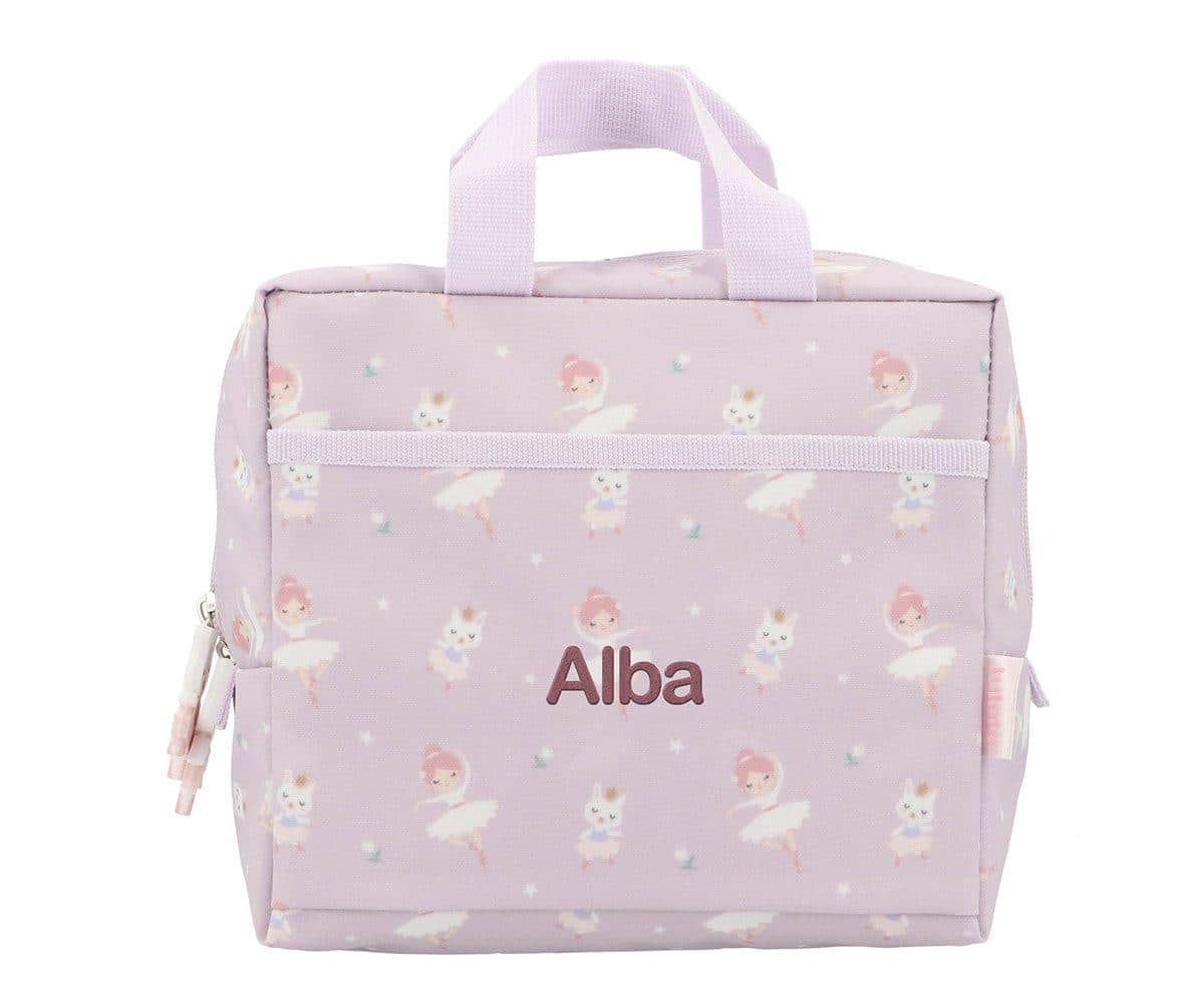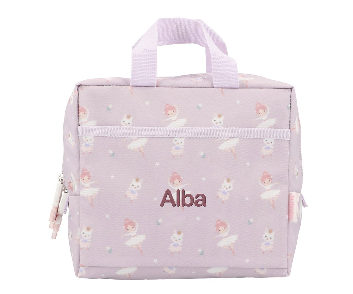 Tiene 2 asas cortas, para fácil transporte, y un bolsillito exterior donde puedes guardar cubiertos o pequeños objetos que necesites tener más a mano, que se puede personalizar con el nombre.