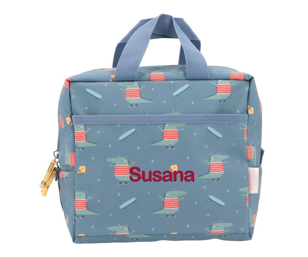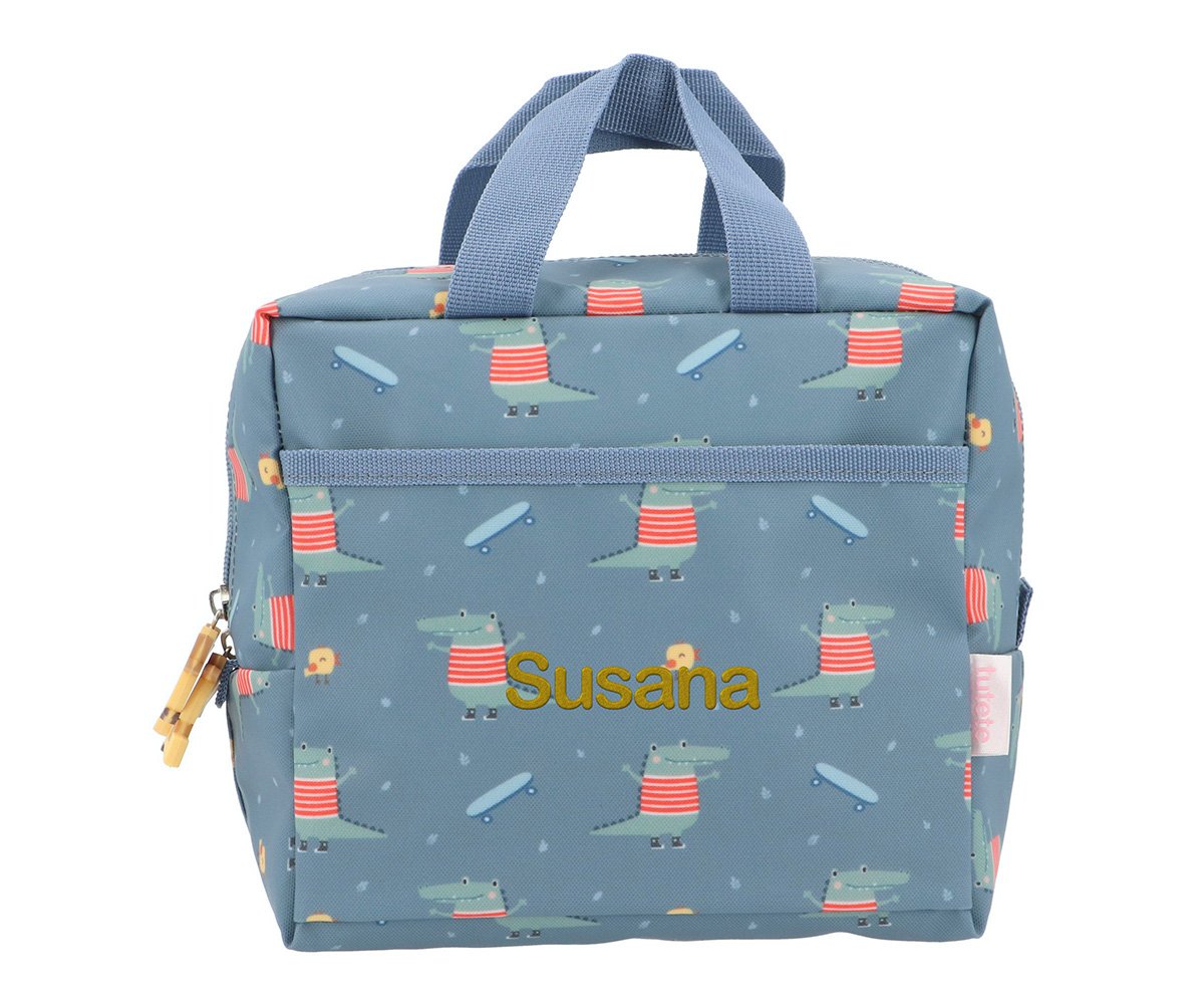 Tiene 2 asas cortas, para fácil transporte, y un bolsillito exterior donde puedes guardar cubiertos o pequeños objetos que necesites tener más a mano, que se puede personalizar con el nombre.