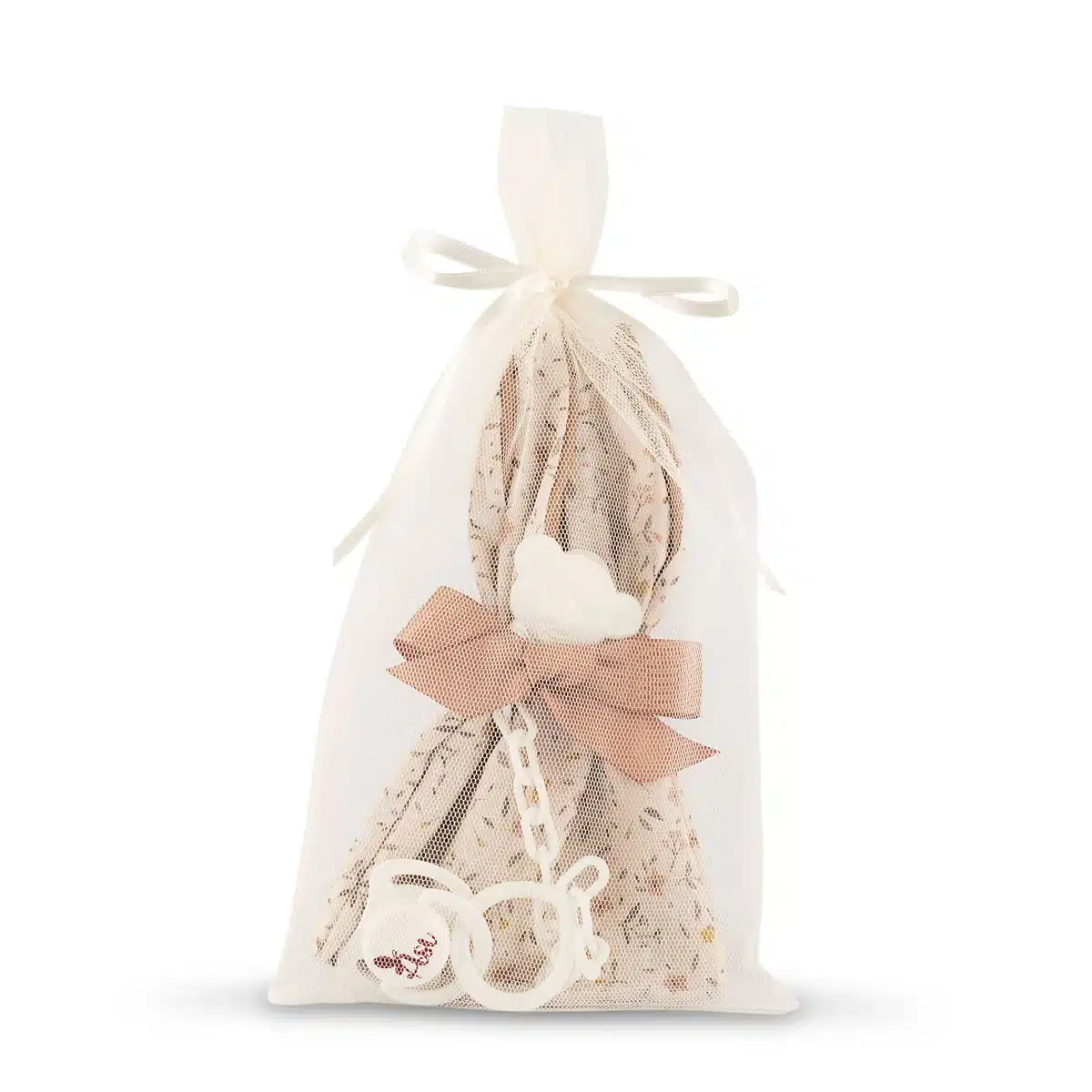 La Bolsa Portachupete con Chupete de la Colección Teresa es el complemento perfecto para los muñecos de tu pequeño. Este set incluye un chupete decorativo y una delicada bolsa portachupete de tul con lazo beige, diseñada para guardar el accesorio cómodamente y mantenerlo siempre a mano.
