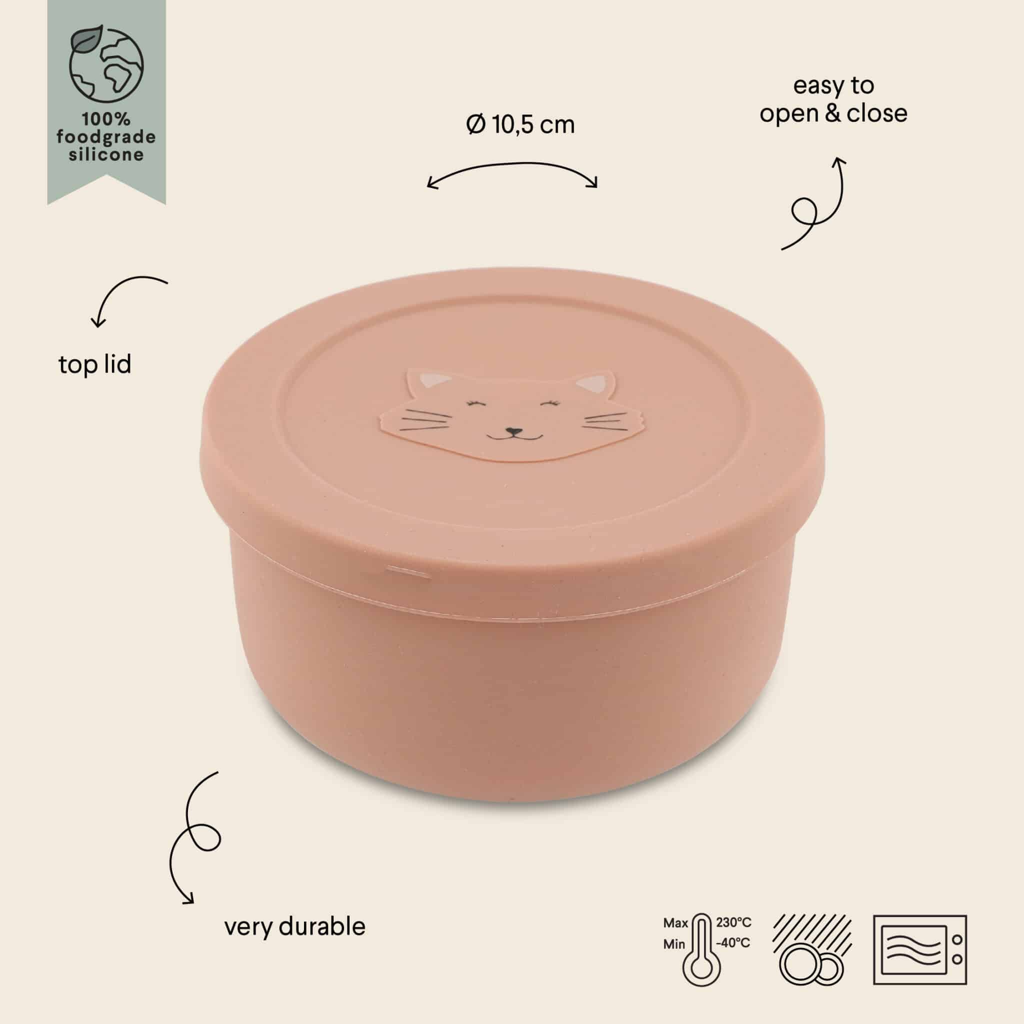 Fabricado en silicona de grado alimentario, este bote es seguro, duradero y libre de BPA, ftalatos y PVC. Su forma compacta lo hace perfecto para llevar en la mochila, bolso o carrito. El diseño tierno con la carita de Mrs. Cat lo convierte en el favorito de los más peques.