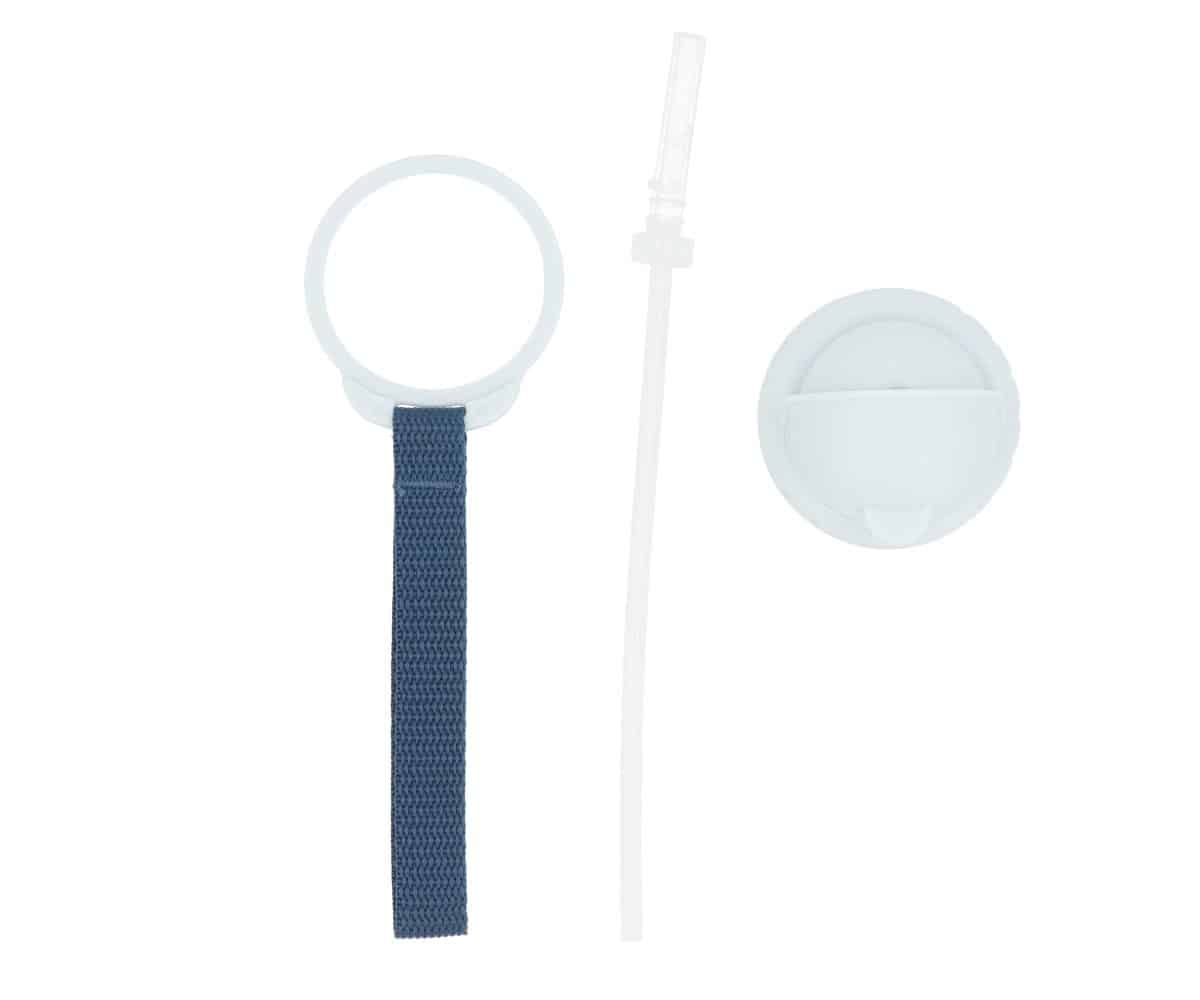 Incluye una pajita de silicona abatible que se despliega al abrir la tapa, permitiendo beber con comodidad y sin derrames. Su asa integrada la convierte en una opción muy práctica, ya que se puede colgar fácilmente en mochilas, carritos o llevar en la mano.