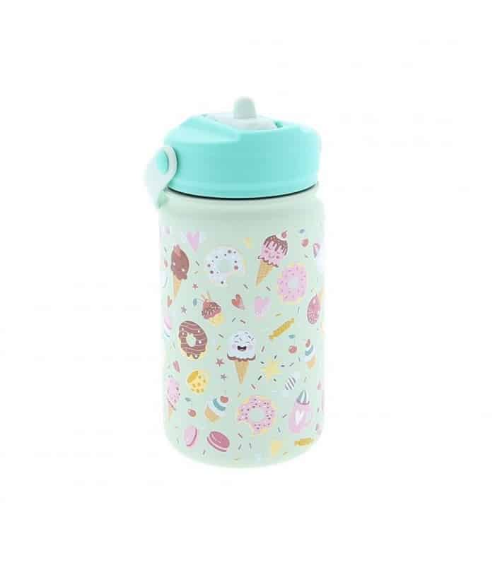 Botella de acero inoxidable con un divertido diseño infantil fabricada con acero de la mejor calidad del mercado, lo que la hace súper resistente y prácticamente irrompible.
