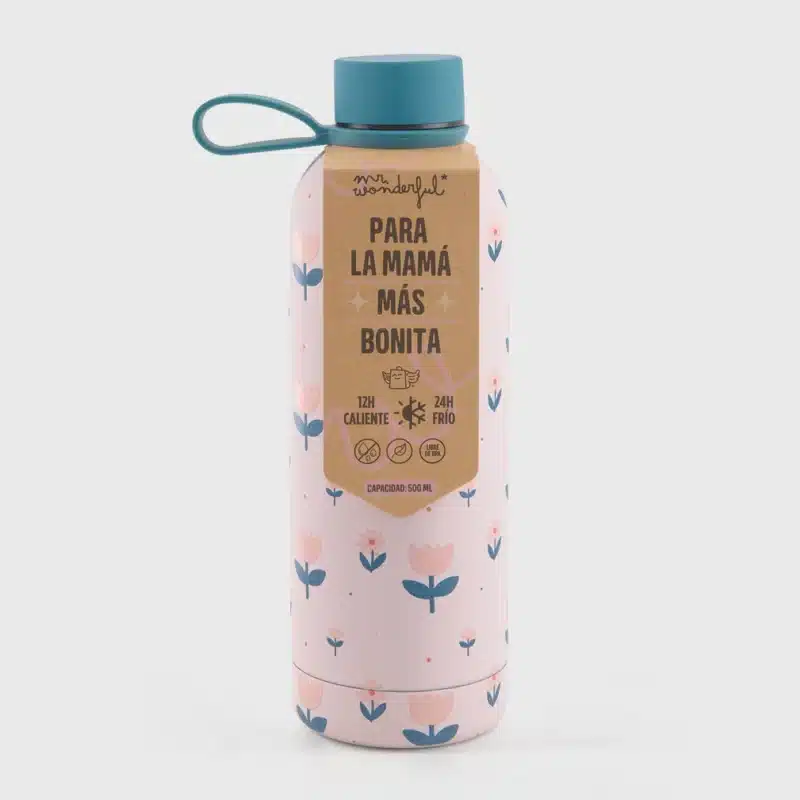 Esta botella térmica de Mr. Wonderful es perfecta para madres activas que necesitan mantenerse hidratadas. Fabricada en acero inoxidable de doble capa, conserva las bebidas frías hasta 24 horas y calientes hasta 12 horas. Su diseño incluye un mensaje divertido que aporta alegría a tu rutina diaria.