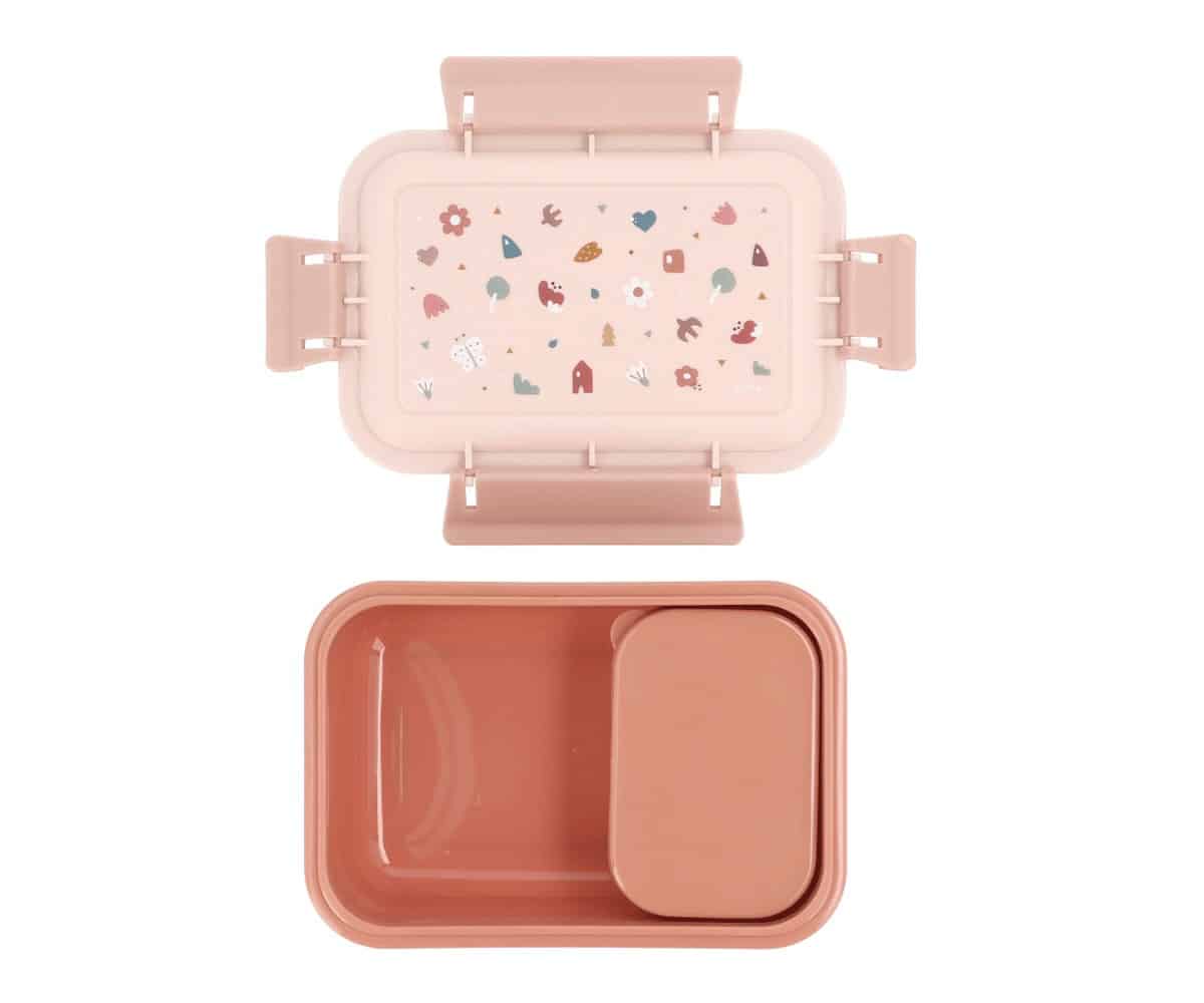 Esta práctica fiambrera incluye una cajita interior separadora con tenedor a juego, ideal para fruta, snacks o pequeñas porciones. La caja principal es completamente hermética gracias a su junta de silicona, y cuenta con cuatro cierres de clic que aseguran el contenido durante el transporte.