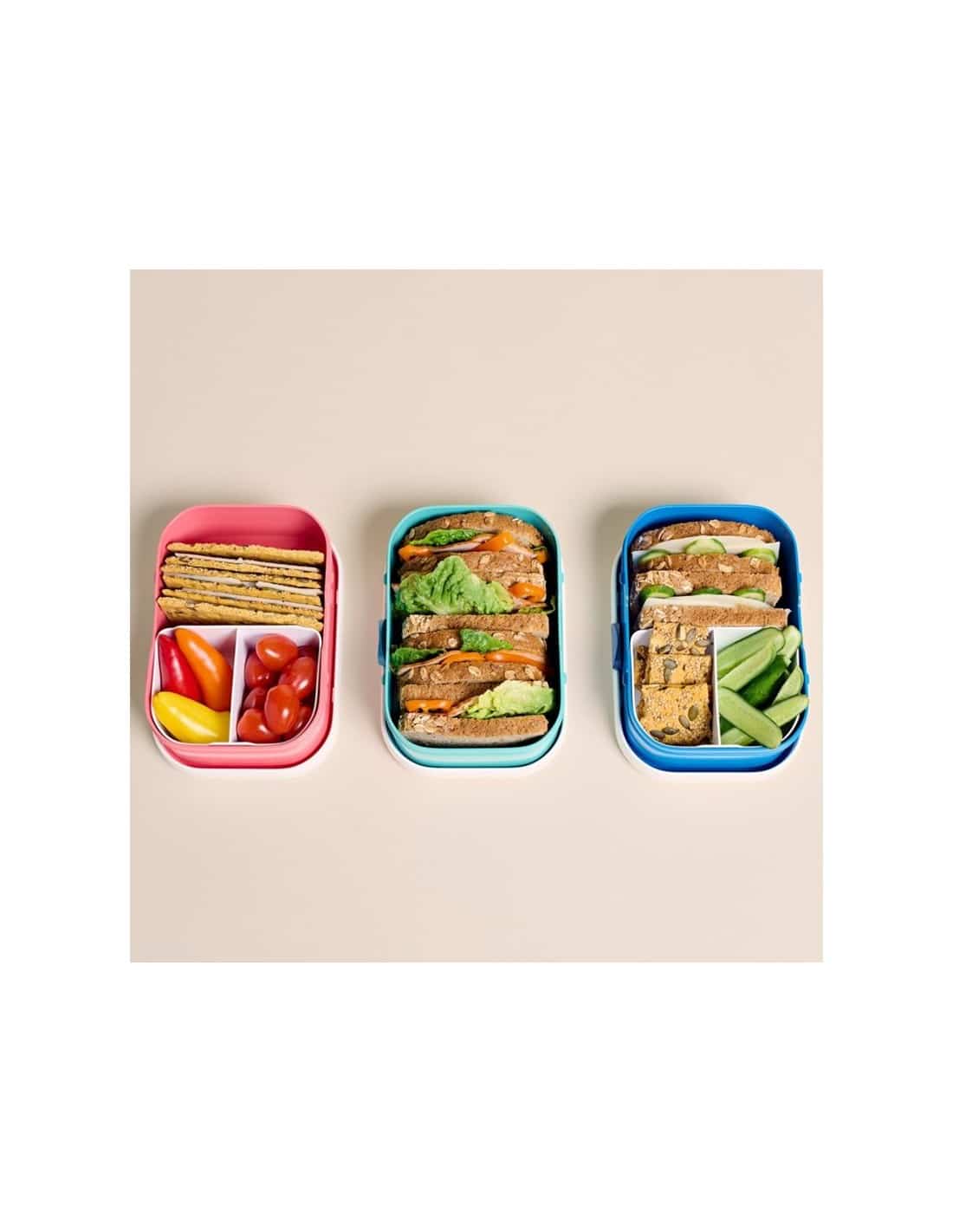 Su cierre hermético garantiza que la comida se mantenga fresca durante horas, y su sistema tipo bento con separador interior y tenedor incluido permite organizar snacks, frutas o platos variados sin mezclar sabores ni texturas.