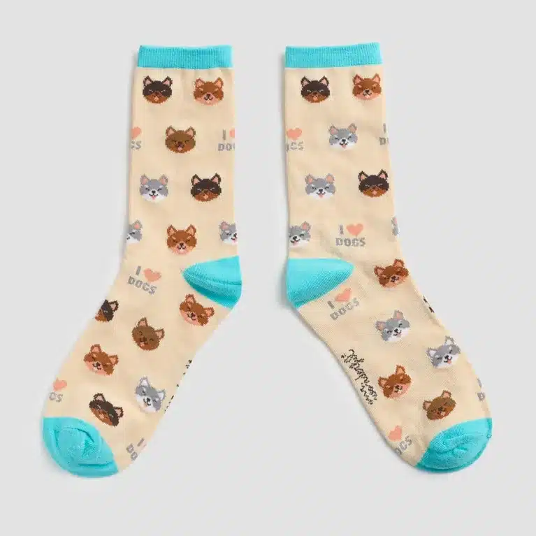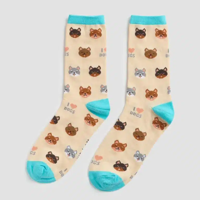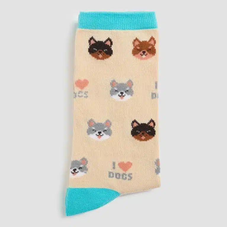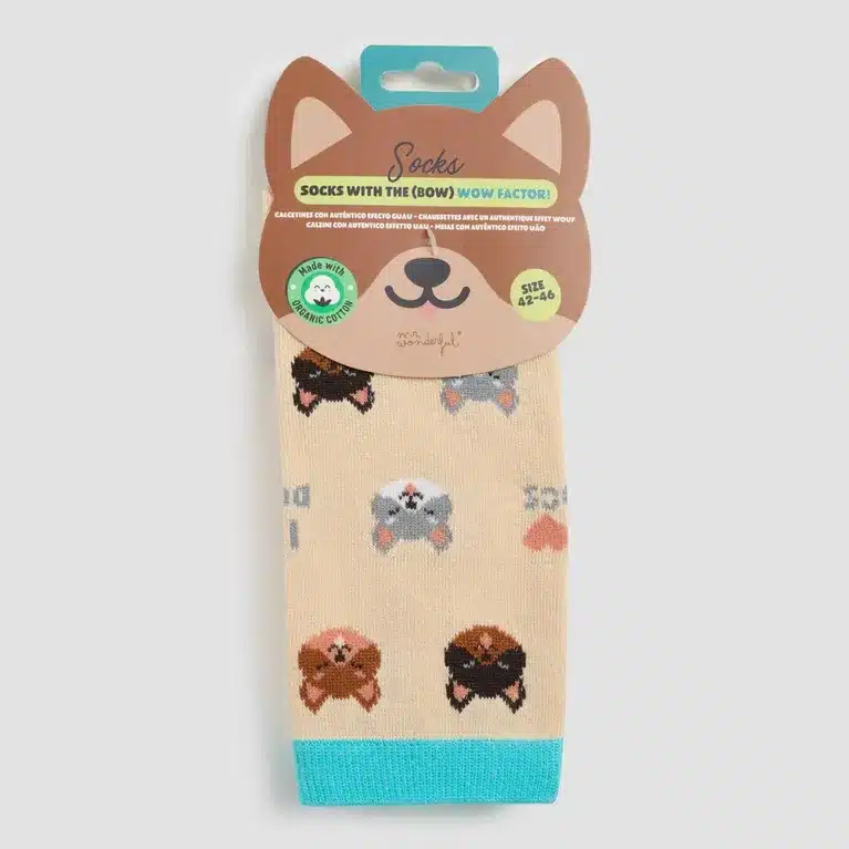 Calcetines con estampado de caras de perritos, disponibles para las tallas 35-38, 39-41 y 42-46. Realizados con algodón orgánico y tintes ecológicos.