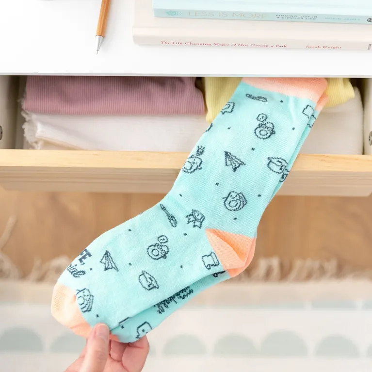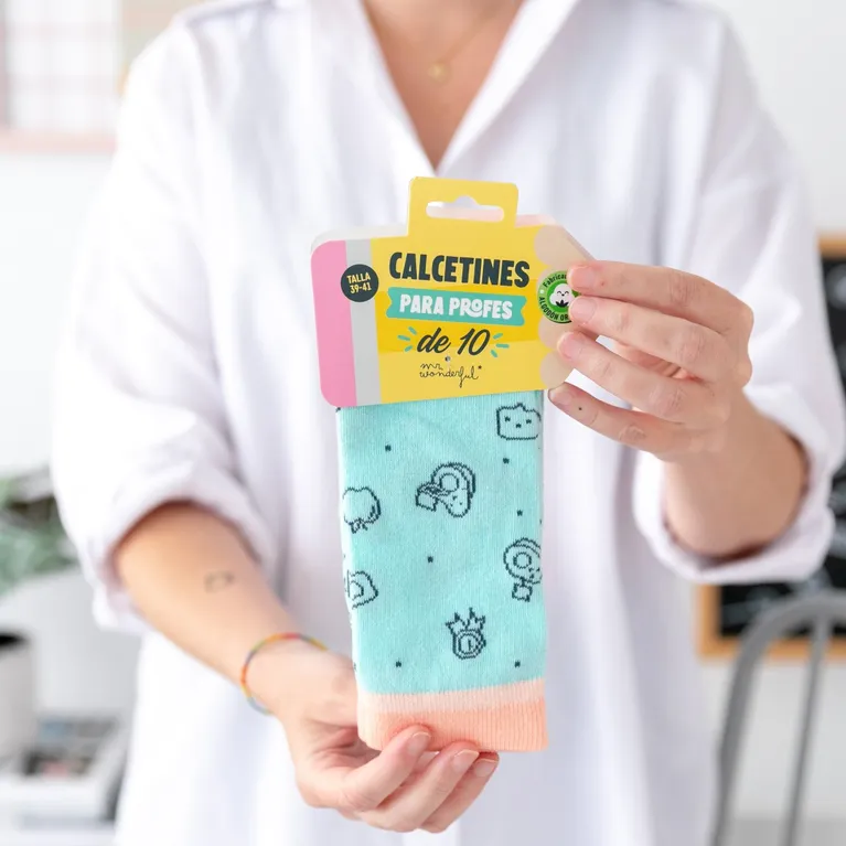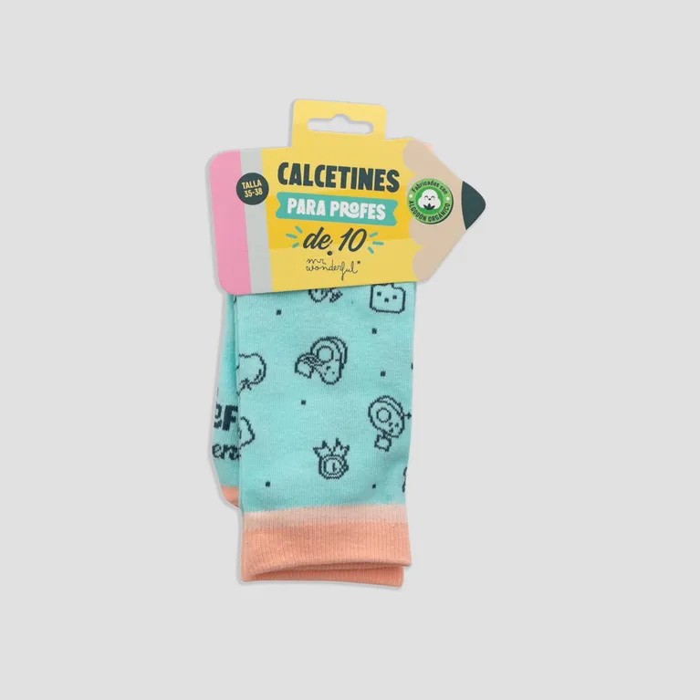 Calcetines con mensaje para profes, de media caña. El mensaje se encuentra en la puntera de los calcetines y el estampado tiene motivos escolares. Disponibles en dos tallas: 35-38 y 39-41. Composición: 65 % algodón orgánico, 32 % poliéster, 3 % nailon.