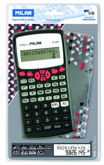 Calculadora Científica Milan Calculadora con pantalla de 2 líneas de lectura, de 10+2 dígitos Visualización de expresión y resultado de manera simultánea 240 funciones integradas, incluyendo 124 científicas. Funciones trigonométricas, funciones parabólicas e hiperbólicas y cálculo de hasta 6 tipos de regresión diferentes; memoria para almacenamiento de medias Cálculo automático de quebrados, teclas de cursor para desplazarse por los menús, estructuración de paréntesis de hasta 24 niveles, memoria para almacenar las variables, cómputos en grado centesimal, sexagesimal y medida de arco, transformación mutua entre coordenadas rectangulares y coordenadas polares, conversión mutua entre sistemas decimal y sexagesimal, generador de valores aleatorios, porcentajes, fracciones, combinaciones, permutaciones, cálculos estadísticos, teclas grandes con disposición estructurada, funciones de notación SCI/FIX/ENG, formación de sumas Alimentación: 2 pilas AAA (incluidas) Dimensiones:8.40 x 16.70 x 1.90