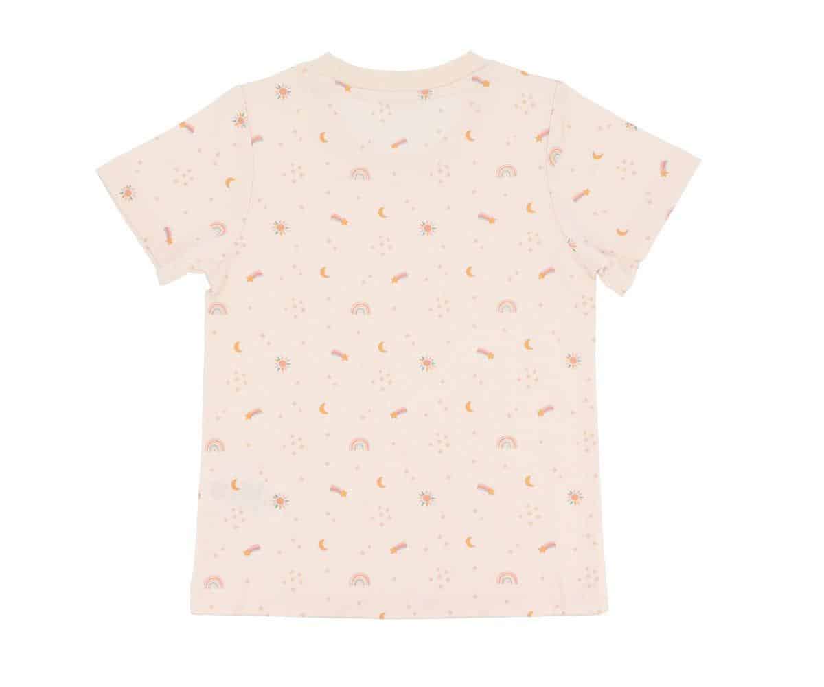 Con un corte de manga corta y cuello redondeado, esta camiseta destaca por su estampado galáctico, lleno de estrellas y detalles cósmicos en tonos suaves, que invitan a imaginar y explorar. Puedes combinarla con el pantalón corto a juego o con los accesorios de la colección Starlight para completar un look brillante y cómodo.