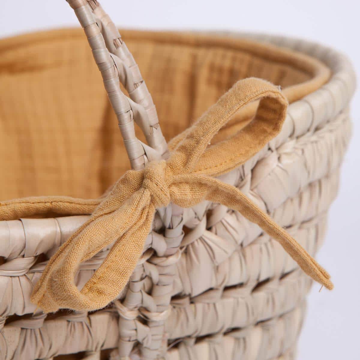 Este pequeño capazo de material natural, relleno de gasa de algodón orgánico mostaza, es muy práctico para transportar las muñecas de tu hij@. También se puede utilizar como cama o cesto pequeño en ocasiones.