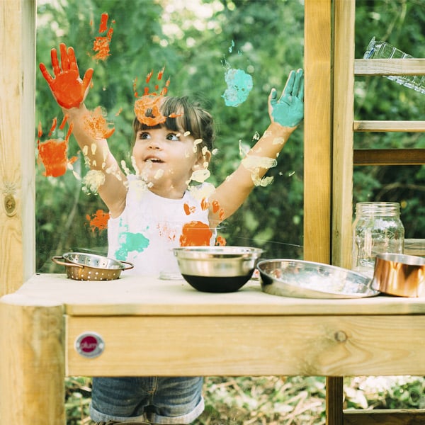 Inspiradora, creativa, natural y bonita: así es esta cocinita de madera para exterior, con la que los peques podrán preparar sus delicatessen en medio del bosque o el jardín. Incorpora una pantalla para pintar o anotar el menú del día, un móvil de viento y una maceta para que puedan cultivar sus propias frutas, legumbres o plantas aromáticas. ¡Porque no hay nada más bueno que los productos frescos de la huerta!