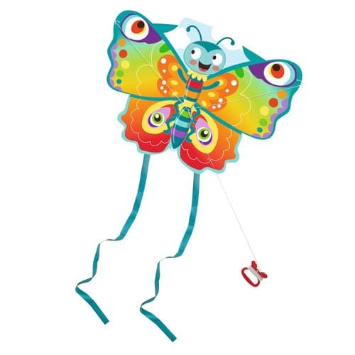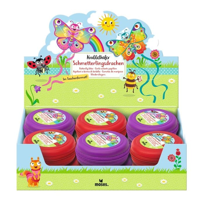 Cometa de bolsillo con forma de mariposa. Tamaño aprox.: 51 cm x 36 cm. Longitud del cable: 20 metros aprox. Display de 12 unidades 2 modelos diferentes