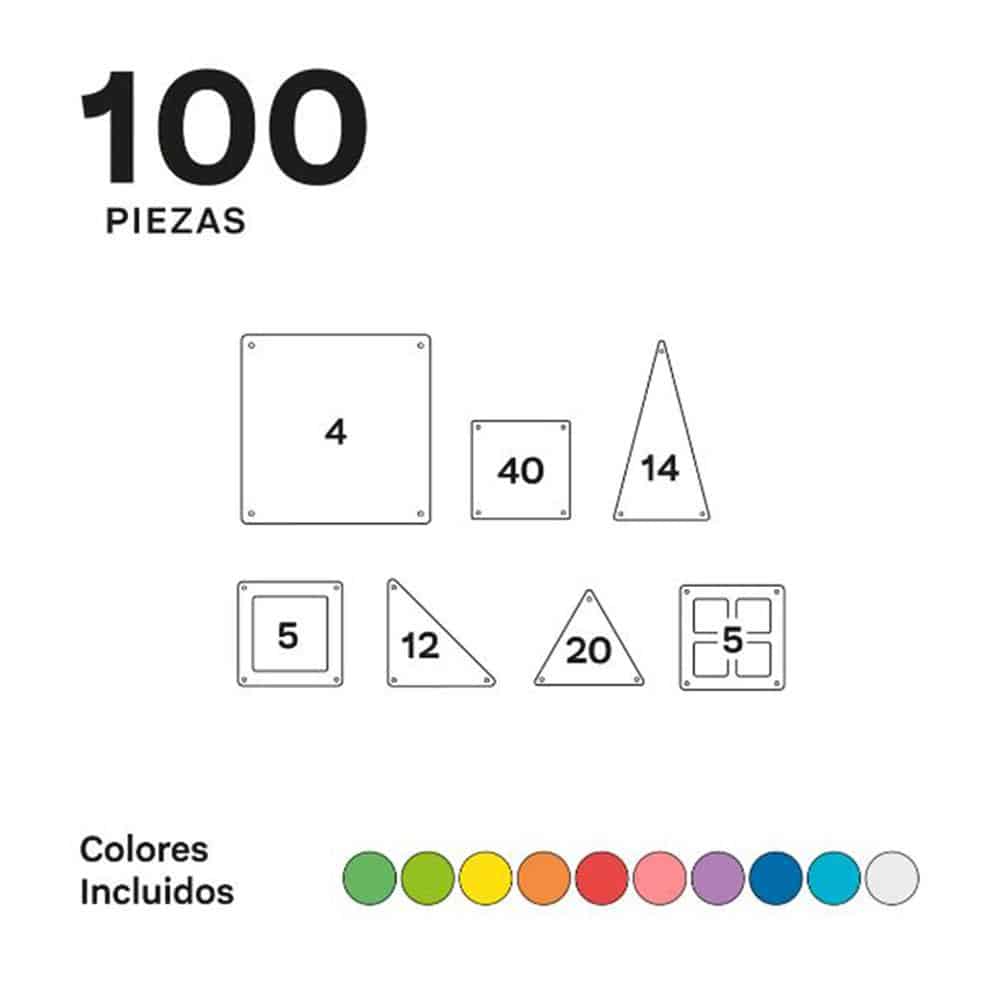 Descubre un sencillo sistema de construcción mediante conexión entre piezas con distintas formas geométricas sólidas y colores translúcidos. Con ellas podrás crear fantásticas estructuras en 2D y en 3D, ¡y asegurarte horas de diversión! Además, al ser translucido, también podrán jugar sobre a mesa de luz y ampliar las horas de juego.