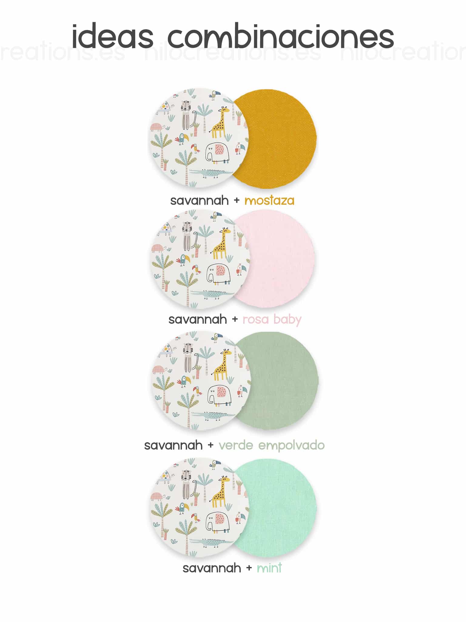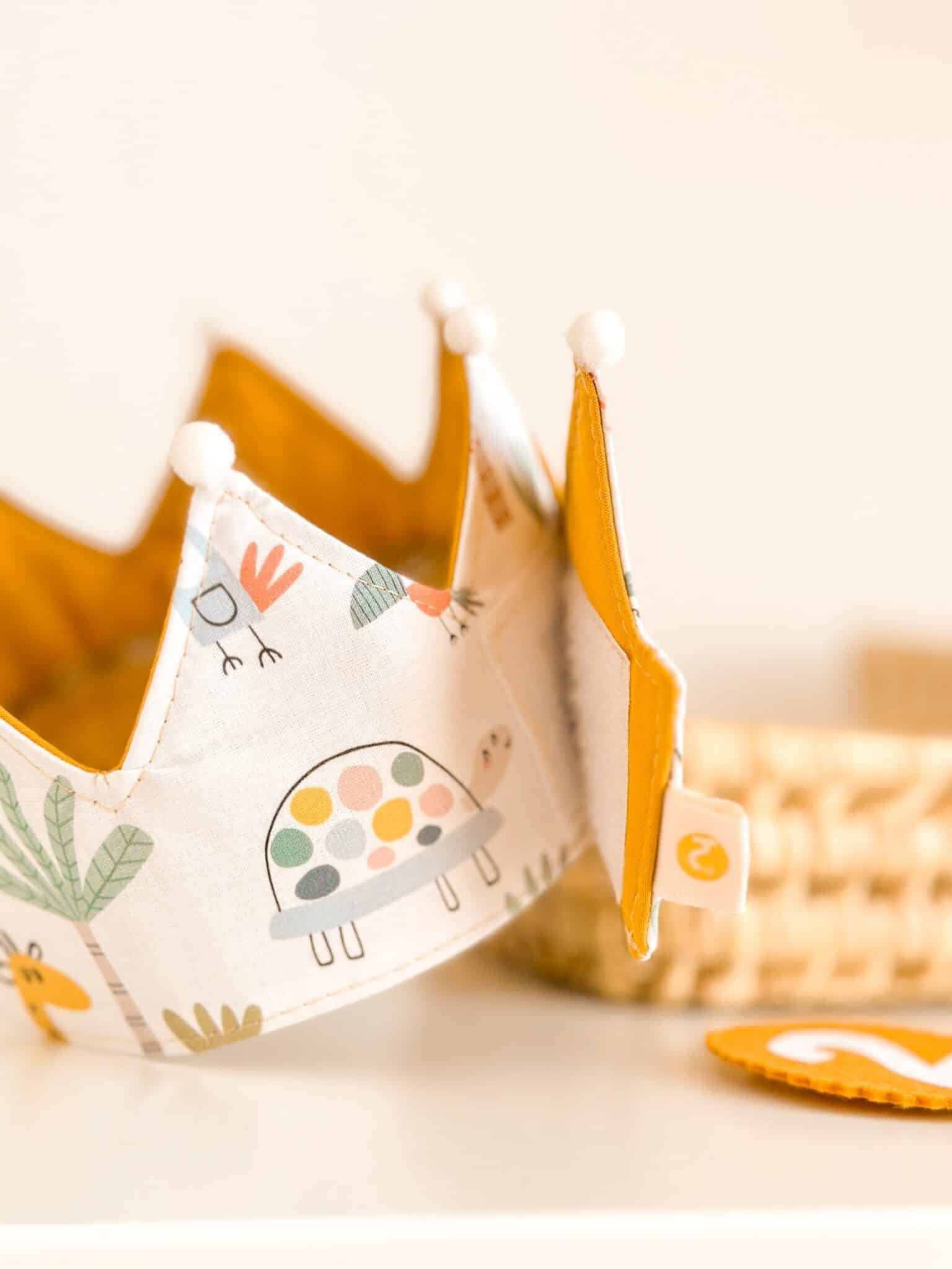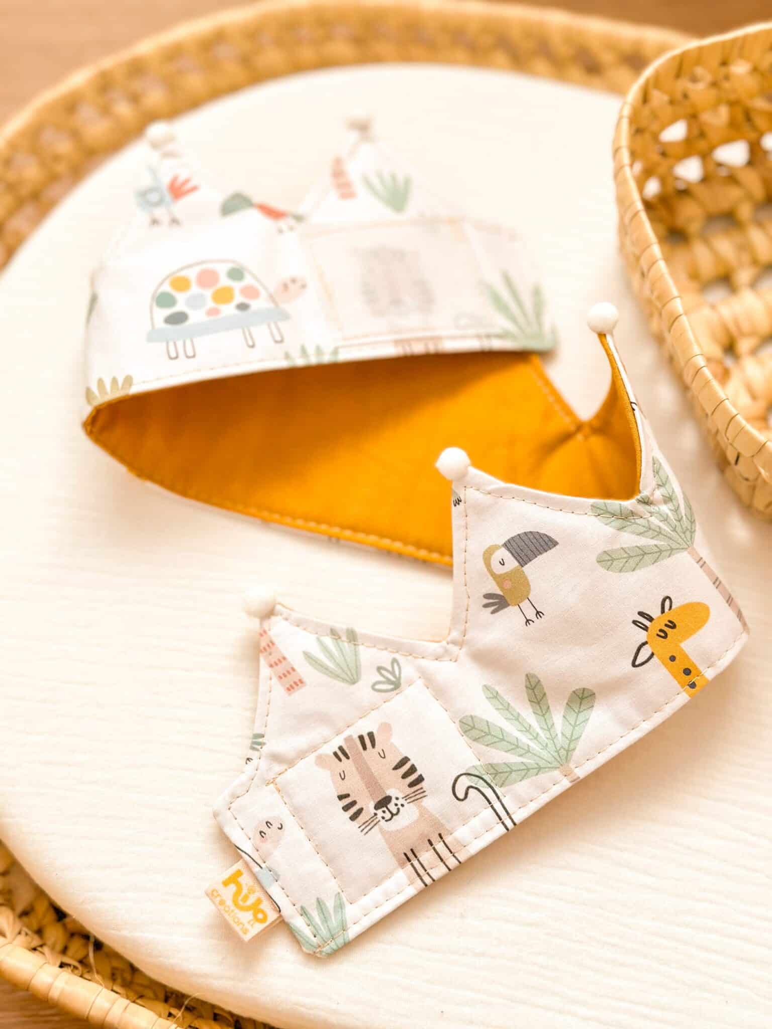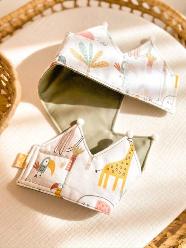 Corona hecha 100% a mano en el taller de Hilocreations con tela de algodón. Con estampado de SAVANNAH y disponible en varios colores diferentes para la parte lisa.