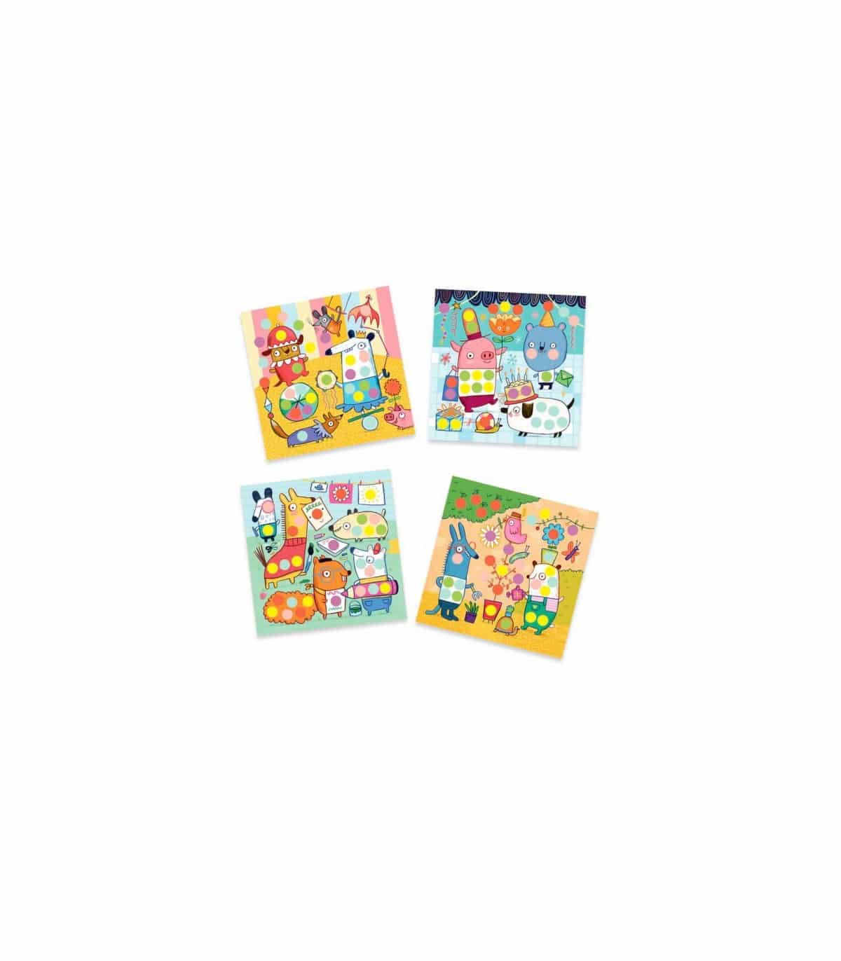 16 tarjetas de 4 dibujos distintos (20 x 20 cm) y 6 hojas de pegatinas (484 piezas).