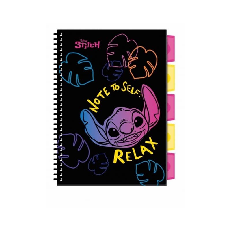 La espiral metálica resistente permite una apertura de 360°, facilitando su uso en todo momento. Su tapa dura plastificada protege el interior del desgaste diario. El diseño de Stitch en fondo negro aporta un toque divertido y moderno a cualquier escritorio o mochila.