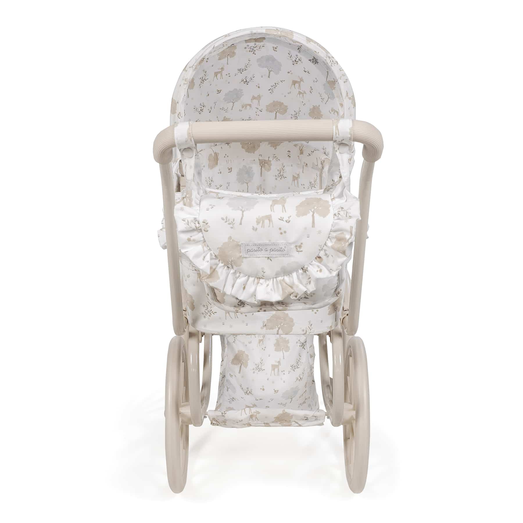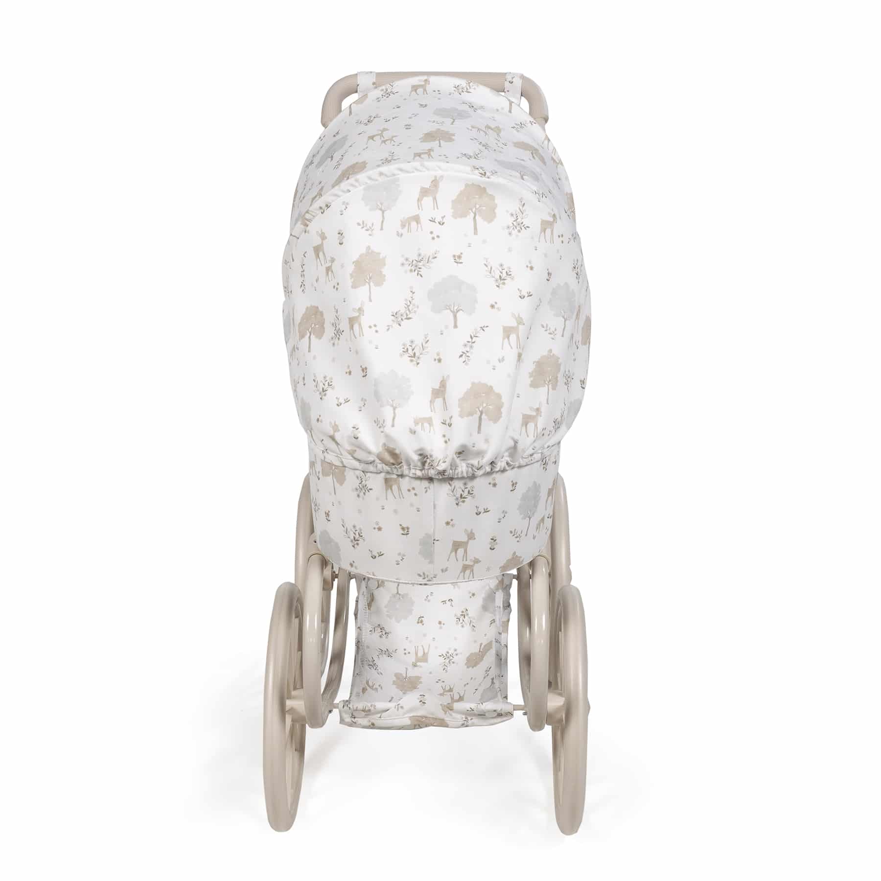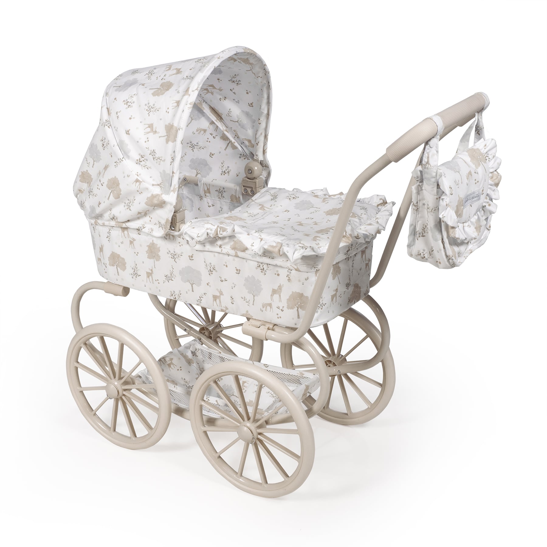 Cuco clásico para muñecas Nara – Cochecito vintage plegable con ruedas grandes con estampado cervatillos – Pasito a Pasito – Juego simbólico desde 3 años