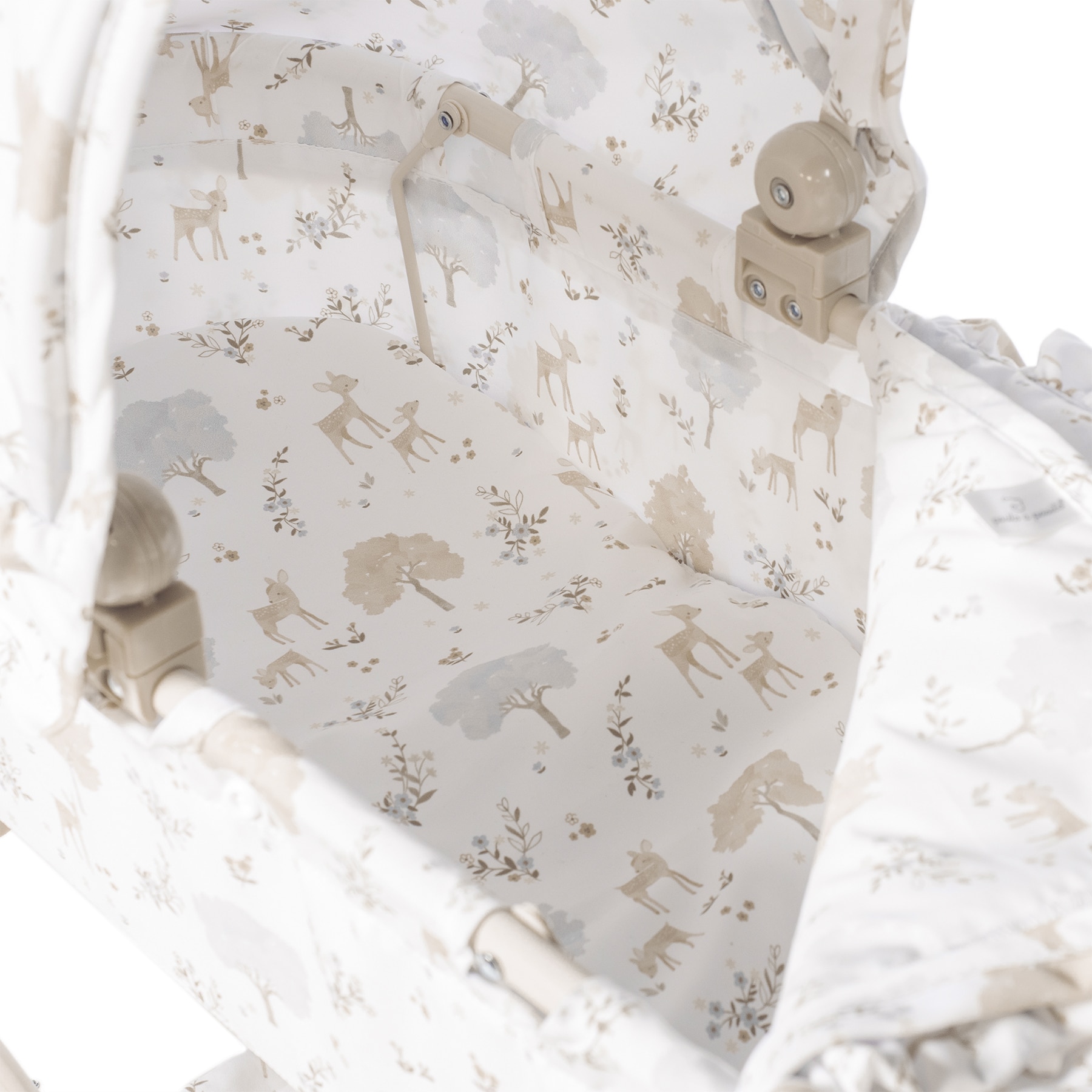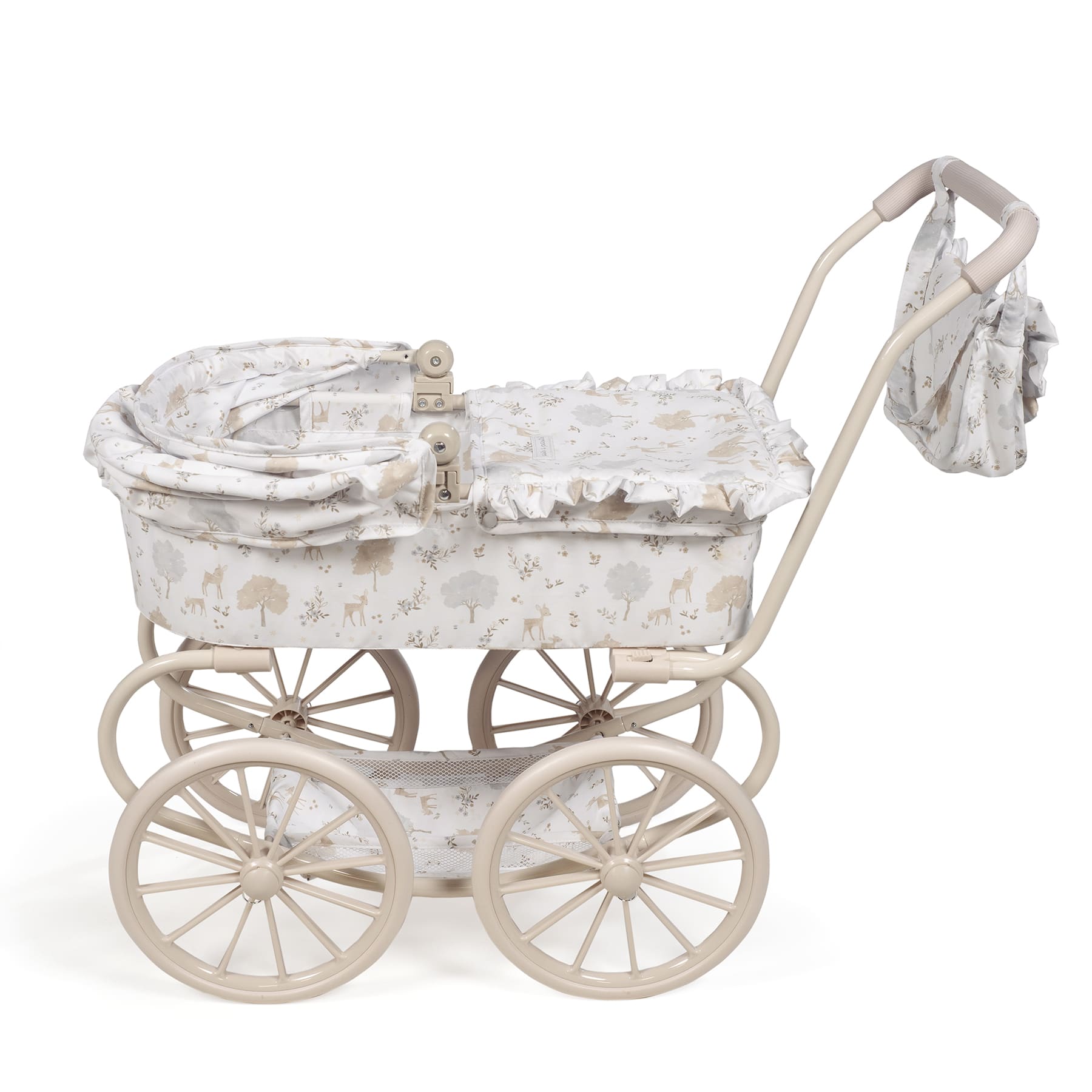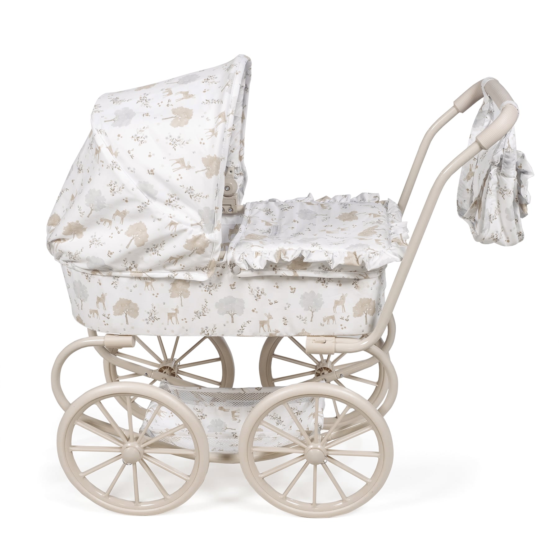 Cuco clásico para muñecas Nara – Cochecito vintage plegable con ruedas grandes con estampado cervatillos – Pasito a Pasito – Juego simbólico desde 3 años