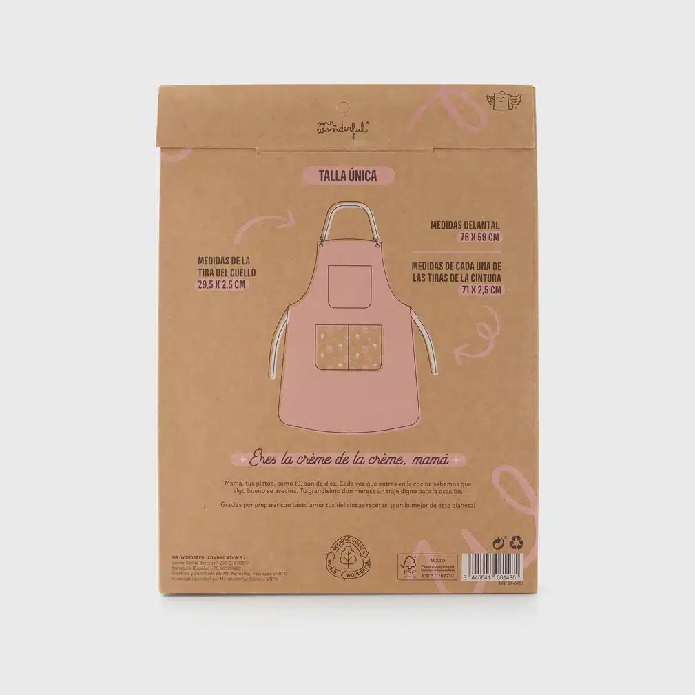 Este delantal es perfecto para madres que ponen el corazón en cada receta. Confeccionado en algodón y detalles en PU, ofrece comodidad y un diseño encantador con el mensaje «Mamá, ¡estás en tu punto!». Su talla única y tiras ajustables en cuello y cintura aseguran un ajuste perfecto para cualquier figura.