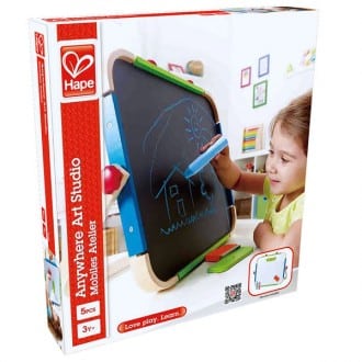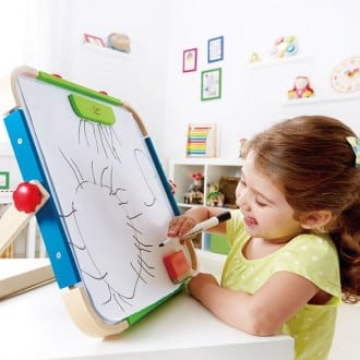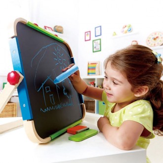 Este tablero de dibujo mantiene a los artistas ocupados con una pizarra blanca, una pizarra de tiza, y figuras magnéticas. ¡Genial para que las mentes creativas puedan pintar on the go!