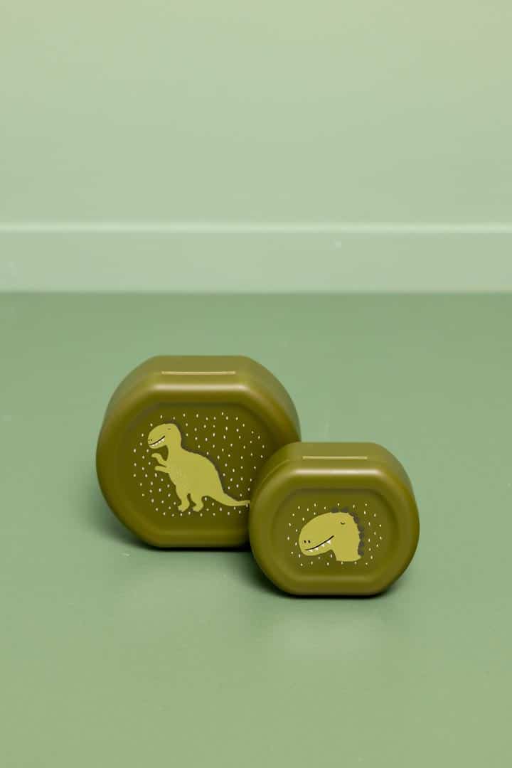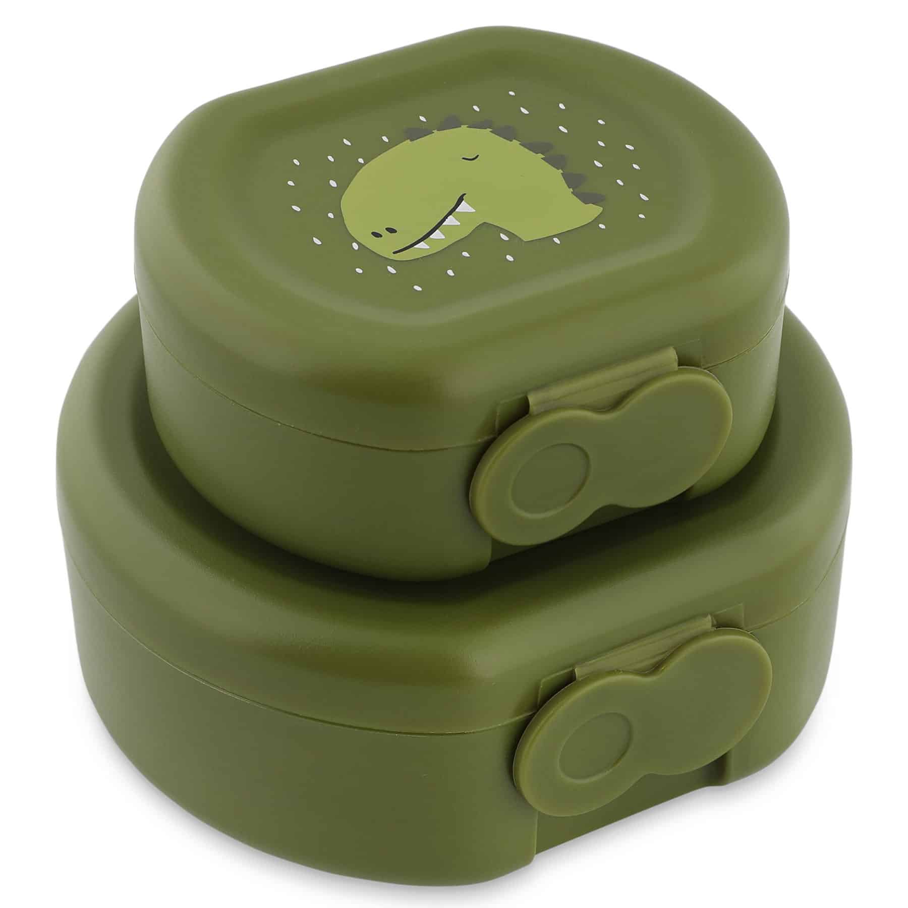 El set de fiambreras con clip modelo Mr. Dino de Trixie está diseñado para facilitar las comidas y meriendas fuera de casa de los más pequeños. Con un diseño encantador de dinosaurio verde con ilustraciones alegres, estas cajitas combinan funcionalidad y diversión.