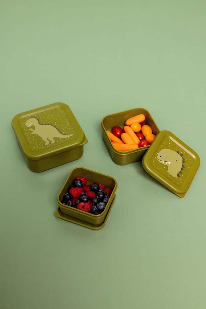 Set de 3 fiambreras infantiles con diseño de dinosaurio. Ideales para separar alimentos y llevar al cole, excursiones o picnics.