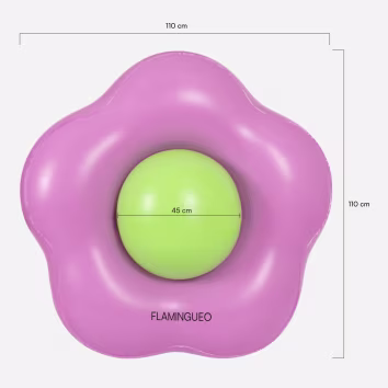 Flotador gigante en forma de flor, fabricado en PVC resistente, disponible en morado y verde. Ideal para disfrutar en la piscina o la playa con comodidad y diversión.