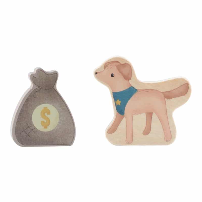 Incluye cuatro figuras (dos policías y dos ladrones), un perro policía, una bolsa de dinero, conos de señalización y un control de carretera, proporcionando todo lo necesario para crear escenarios de juego completos. La celda trasera cuenta con puerta abatible, permitiendo transportar a los ladrones de forma segura durante las misiones policiales.