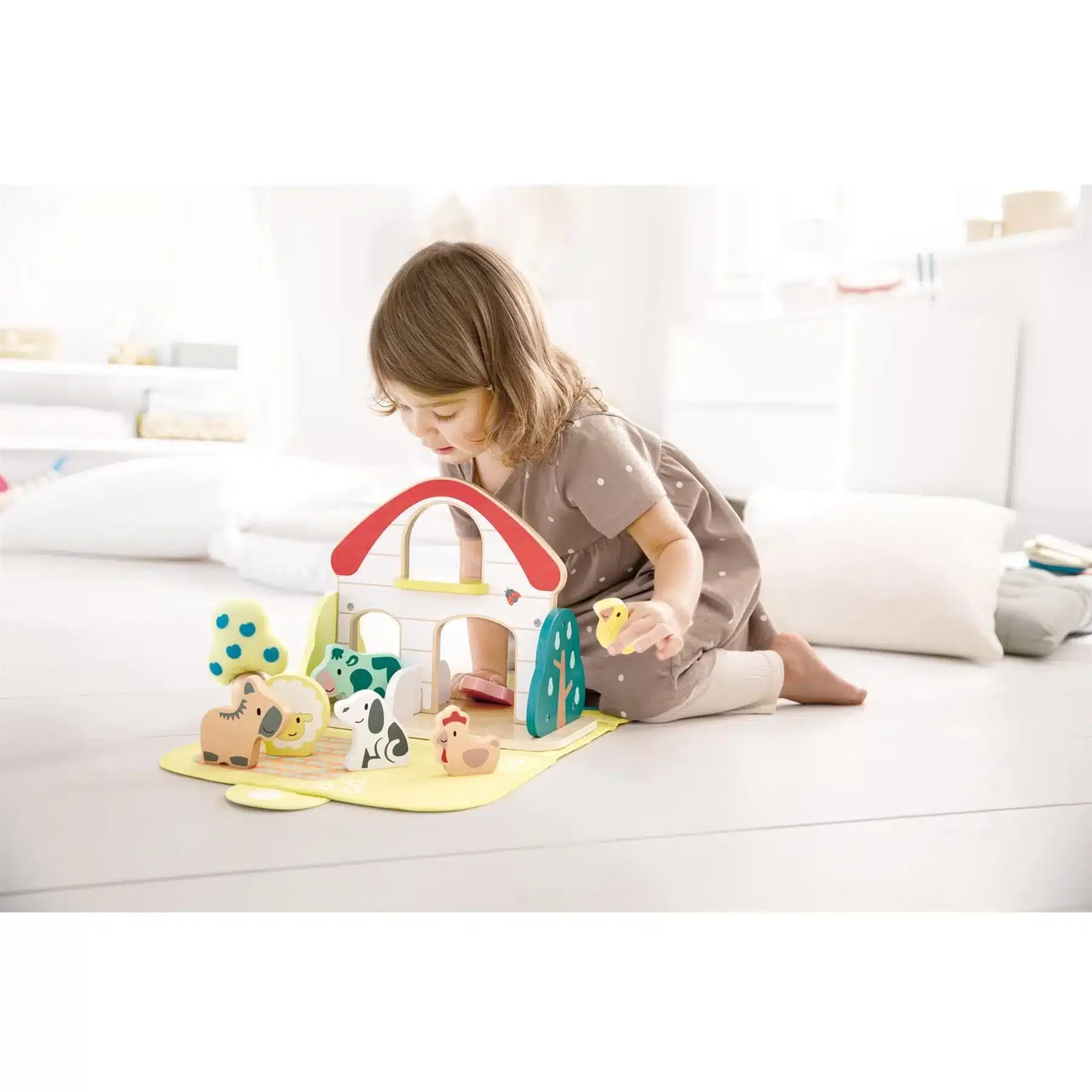 La Granja Hape Faith es el juego perfecto para cualquier pequeño amante de los animales. Se trata de una colorida granja de madera construida sobre una práctica alfombra de juego textil que crea una auténtica experiencia de granja para los niños. El juego portátil consta de ocho animales de granja y otros accesorios de madera y tela. Gracias al asa de transporte de madera integrada, el juego puede llevarse fácilmente a cualquier parte.