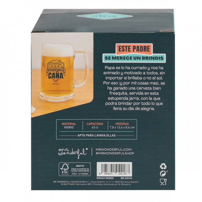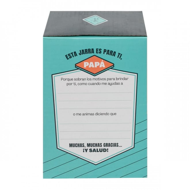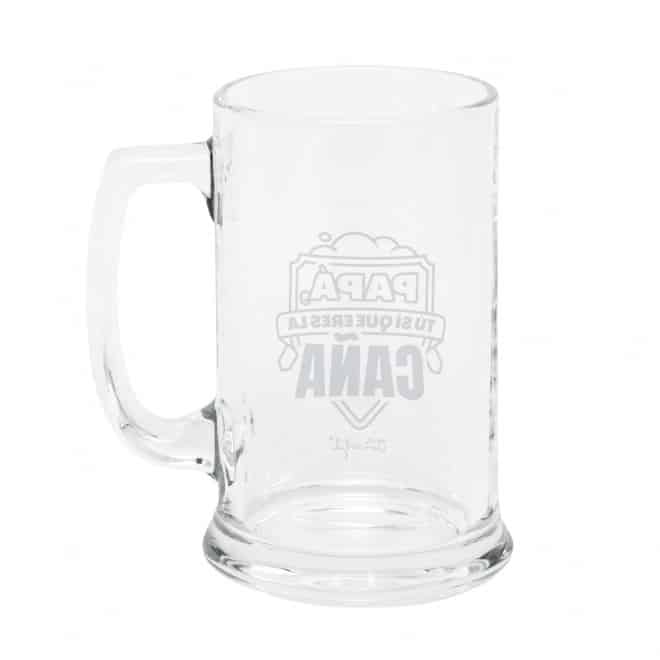 – Jarra de cerveza realizada en vidrio, con mensaje en español dirigido a padres.