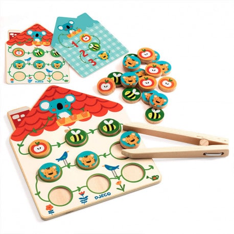 Pinstou de Djeco es un juego educativo ideal para niños a partir de 3 años, diseñado para desarrollar habilidades clave como la coordinación mano-ojo, el reconocimiento de colores y la noción de cantidad. Consta de 12 tarjetas de actividades, 18 piezas de colores y 1 pinza de madera, que permiten realizar ejercicios manipulativos y divertidos.