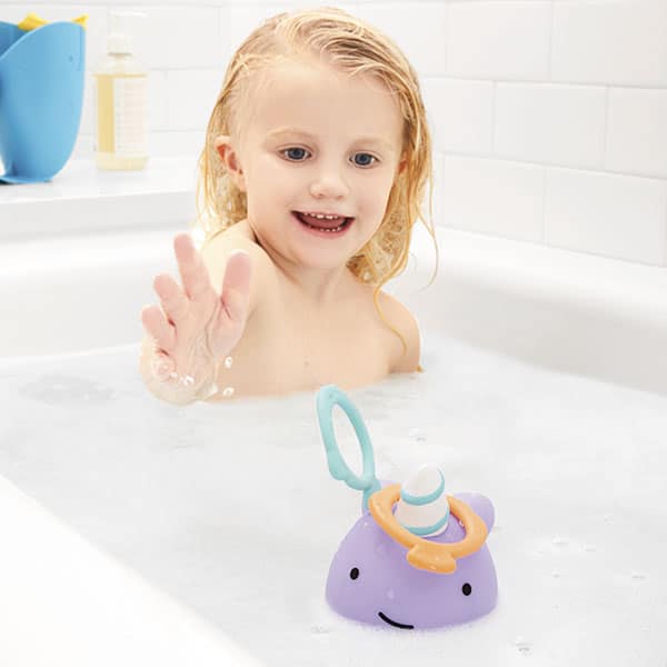 Juguete de baño Narval con el que los peques se lo pasarán en grande en su momento de baño, les costará menos este momento de su rutina y a su vez, les servirá para desarrollar sus habilidades motoras finas. Este juguete incluye tres aros de diferentes colores para que puedan divertirse haciendo puntería.