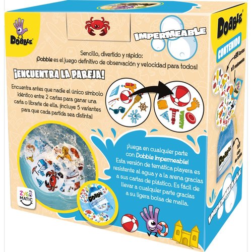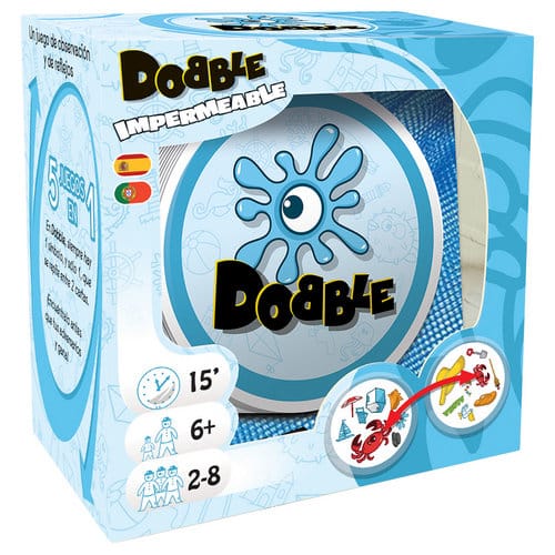 DOBBLE WATERPROOF ES UNA NUEVA VERSION DE ESTE JUEGO DE CARTAS SUPER VENTAS, AHORA CON UN NUEVO DISEÑO QUE TE PERMITIRA ALARGAR LAS HORAS DE DIVERSION EN LA PLAYA O EN LA PISCINA, íGRACIAS A SUS CARTAS RESISTENTES AL AGUA Y SU COMODA BOLSA DE TRANSPORTE! DOBBLE ES UN JUEGO CON MAS DE 50 SIMBOLOS Y SOLAMENTE UN SIMBOLO IDENTICO ENTRE CADA CARTA. ¿SERAS CAPAZ DE DESCUBRIRLO? BUSCA EL SIMBOLO IDENTICO EN DOS CARTAS, DILO EN VOZ ALTA Y COGE O DEJA UNA CARTA, SEGUN LAS REGLAS DEL MINI-JUEGO AL QUE ESTEIS JUGANDO. VELOCIDAD, OBSERVACION Y REFLEJOS… íENCADENA TODOS LOS MINI-JUEGOS EN UN AMBIENTE DELIRANTE!