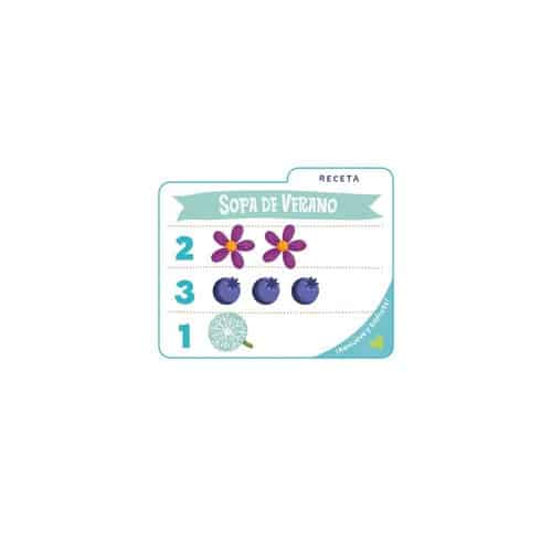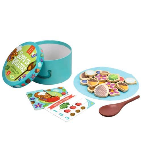 8 tarjetas de receta – 1 cuchara de madera – 24 ingredientes de madera – Reglas de juego – Guía para padres