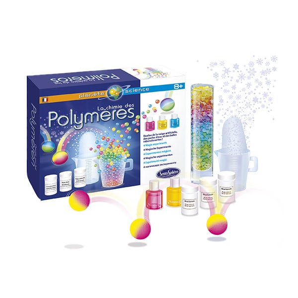 Este kit es una fuente de sabiduría para el peque. Va a descubrir los polímeros, los «nuevos» materiales que nos rodean, descubiertos apenas hace un siglo. Se pueden soldar con agua, botar, mantener o absorber la humedad, aumentar cinco veces su tamaño en un par de segundos o incluso convertirse en alucinantes decoraciones florales.